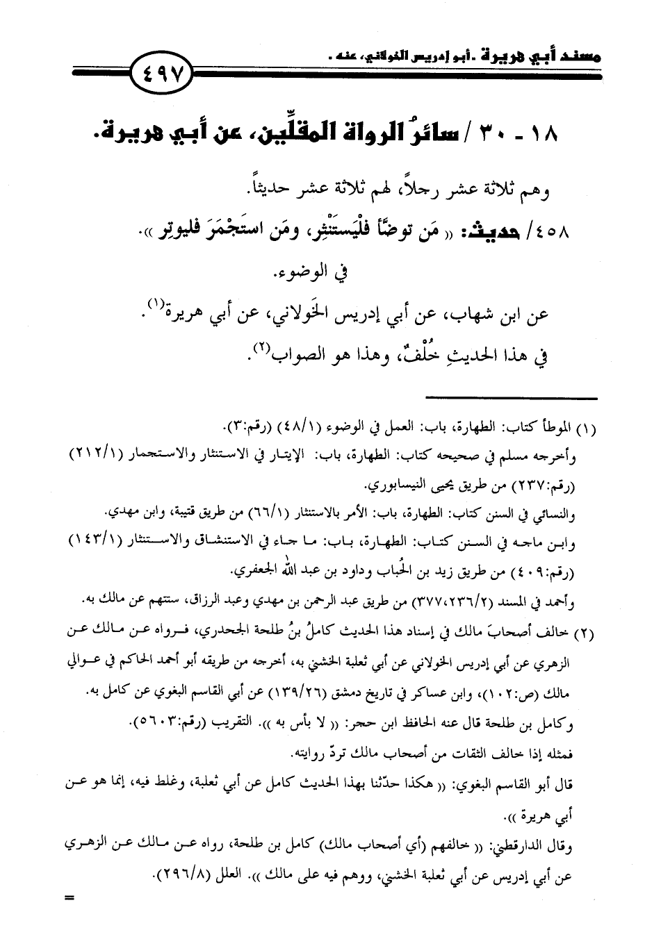 ٤٥٨ / حديث: "مَن توضَّأ فلْيَستَنْثِر، ومَن استَجْمَرَ فليوتِر".