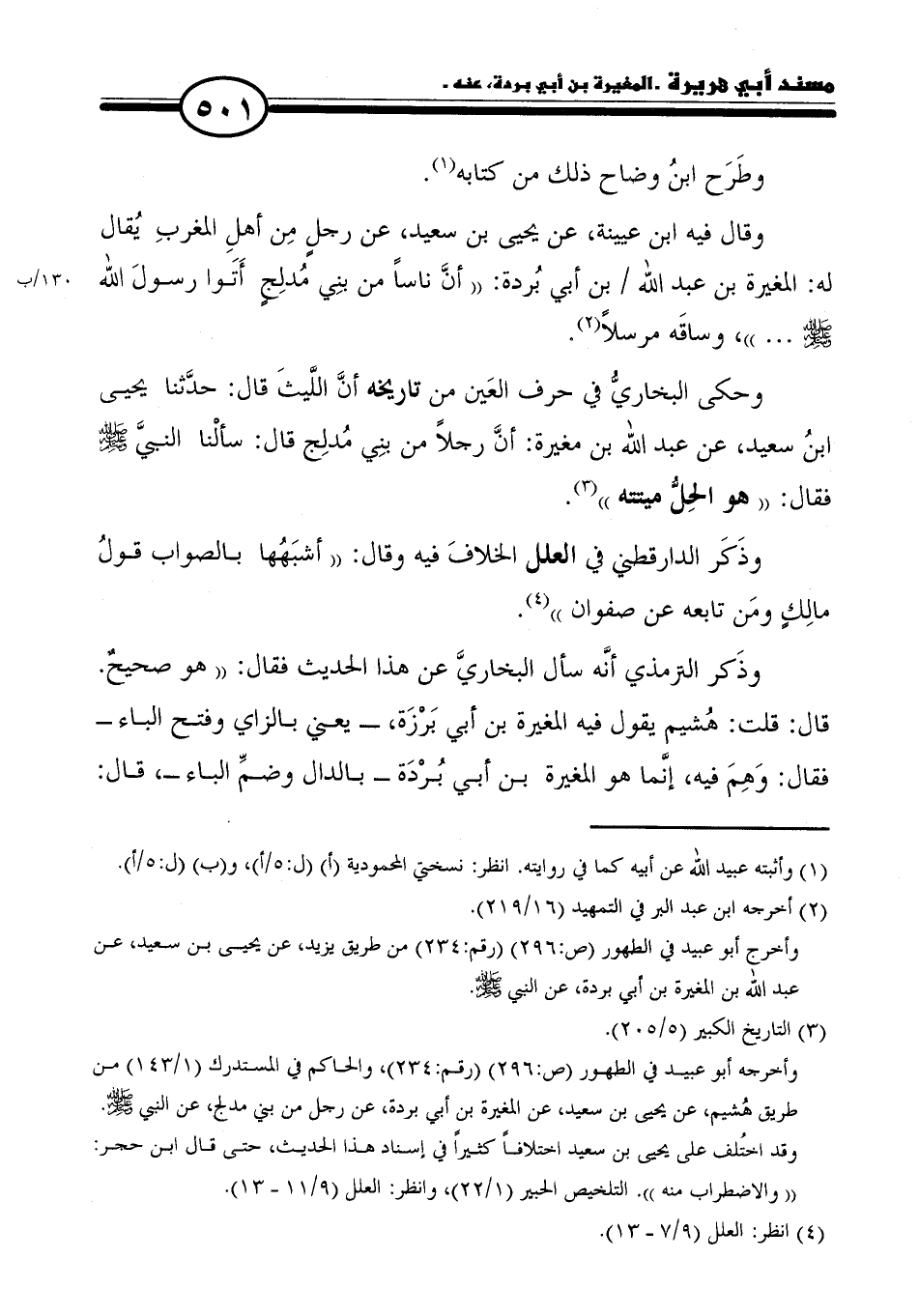 وأخرجه أبو عبيد في الطهور (ص: ٢٩٦) (رقم: ٢٣٤)، والحاكم في المستدرك (١/ ١٤٣) من طريق هُشيم، عن يحيى بن سعيد، عن المغيرة بن أبي بردة، عن رجل من بني مدلج، عن النبي - صلى الله عليه وسلم -. وقد اختُلف على يحيى بن سعيد اختلافًا كثيرًا في إسناد هذا الحديث، حتى قال ابن حجر: "والاضطراب منه". التلخيص الحبير (١/ ٢٢)، وانظر: العلل (٩/ ١١ - ١٣).