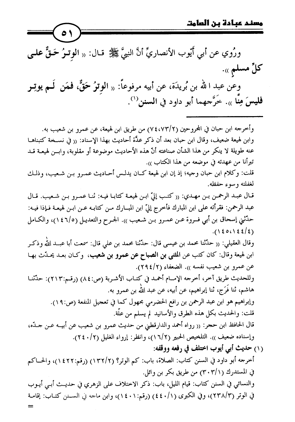 وعن عبد الله بن بُريدَة، عن أبيه مرفوعًا: "الوِترُ حَقٌّ، فمَن لَم يوتِر فليسَ منَّا". خَرَّجهما أبو داود في السنن (١).