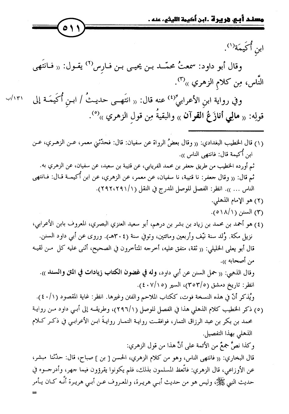 (٥) ذكر الخطيب كلام الذهلي هذا في الفصل للوصل (١/ ٢٩٦)، وطريقه إلى أبي داود من رواية محمَّد بن بكر بن عبد الرزاق التمار، فوافقا رواية التمار روايةَ ابن الأعرابي في ذكر كلام الذهلي بهذا التفصيل.