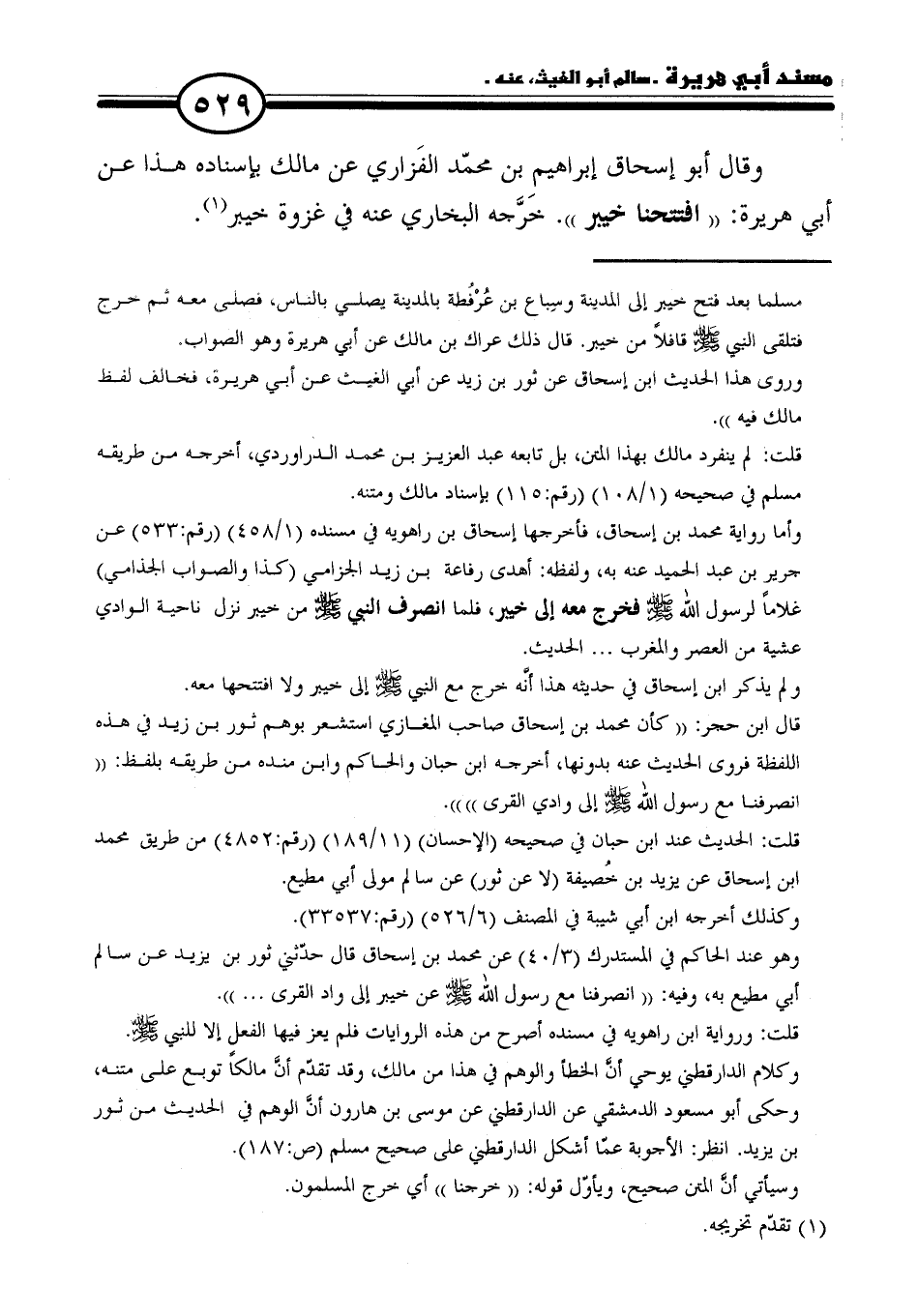 = مسلما بعد فتح خيبر إلى المدينة وسِباع بن عُرفطة بالمدينة يصلي بالناس، فصلَّى معه ثم خرج فتلقى النبي - صلى الله عليه وسلم - قافلًا من خيبر. قال ذلك مالك بن مالك عن أبي هريرة وهو الصواب.