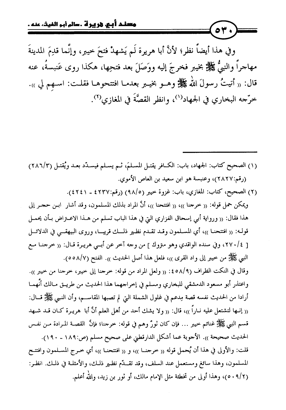 وفي هذا أيضًا نظر؛ لأنَّ أبا هريرة لَم يَشهدْ فتحَ خيبر، وإنَّما قدِمَ المدينةَ مهاجرًا والنبيُّ - صلى الله عليه وسلم - بخيبر فخرجَ إليه ووَصَلَ بعد فتحِها، هكذا روى عَنبسةُ، عنه قال: "أتيتُ رسول الله - صلى الله عليه وسلم - وهو بخيبر بعدما افتتحوها فقلت: اسهِم لي". خرّجه البخاري في الجهاد (١)، وانظر القصَّةَ في المغازي (٢).