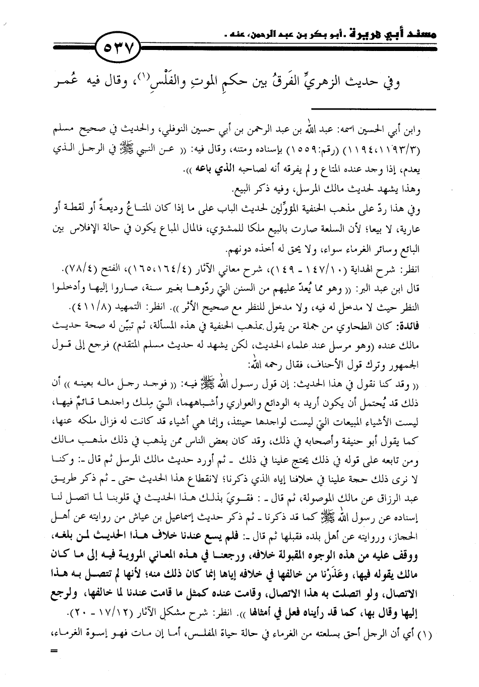 فائدة: كان الطحاوي من جملة من يقول بمذهب الحنفية في هذه المسألة، ثم تبيّن له صحة حديث مالك عنده (وهو مرسل عند علماء الحديث، لكن يشهد له حديث مسلم المتقدم) فرجع إلى قول الجمهور وترك قول الأحناف، فقال رحمه الله: