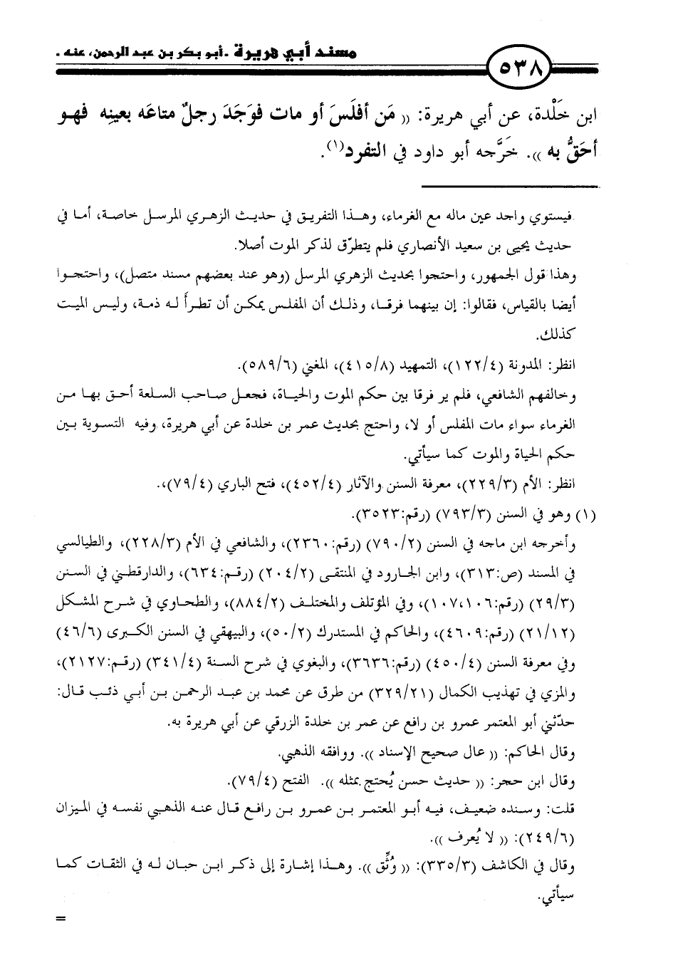 ابن خَلْدة، عنِ أبي هريرة: "مَن أفلَسَ أو مات فوَجَدَ رجلٌ متاعَه بعينِه فهو أحَقُّ به". خَرَّجه أبو داود في التفرد (١).