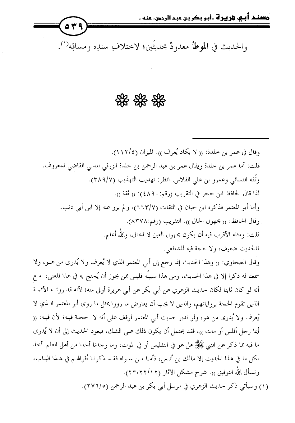وقال الطحاوي: "وهذا الحديث إنما رجع إلى أبي المعتمر الذي لا يُعرف ولا يُدرى من هو، ولا سمعنا له ذكرا إلا في هذا الحديث، ومن هذا سبيلُه فليس ممن يجوز أن يُحتج به في هذا المعنى، مع أنه لو كان ثابتا لكان حديث الزهريّ عن أبي بكر عن أبي هريرة أولى منه؛ لأنه قد روته الأئمة الذين تقوم الحجة برواياتهم، والذين لا يجب أن يعارض ما رووا بمثل ما روى أبو المعتمر الذي لا يُعرف ولا يُدرى من هو، ولو تدبر حديث أبي المعتمر لوقف على أنه لا حجة فيه؛ لأن فيه: "أيما رجل أفلس أو مات"، فقد يحتمل أن يكون ذلك على الشك، فيعود الحديث إلى أن لا يُدرى ما فيه مما ذكر عن النبي - صلى الله عليه وسلم - هل هو في التفليس أو في الموت، وما وجدنا أحدا من أهل العلم أخذ بكل ما في هذا الحديث إلا مالك بن أنس، فأما من سواه فقد ذكرنا أقوالهم في هذا الباب، ونسأل الله التوفيق". شرح مشكل الآثار (١٢/ ٢٢, ٢٣).