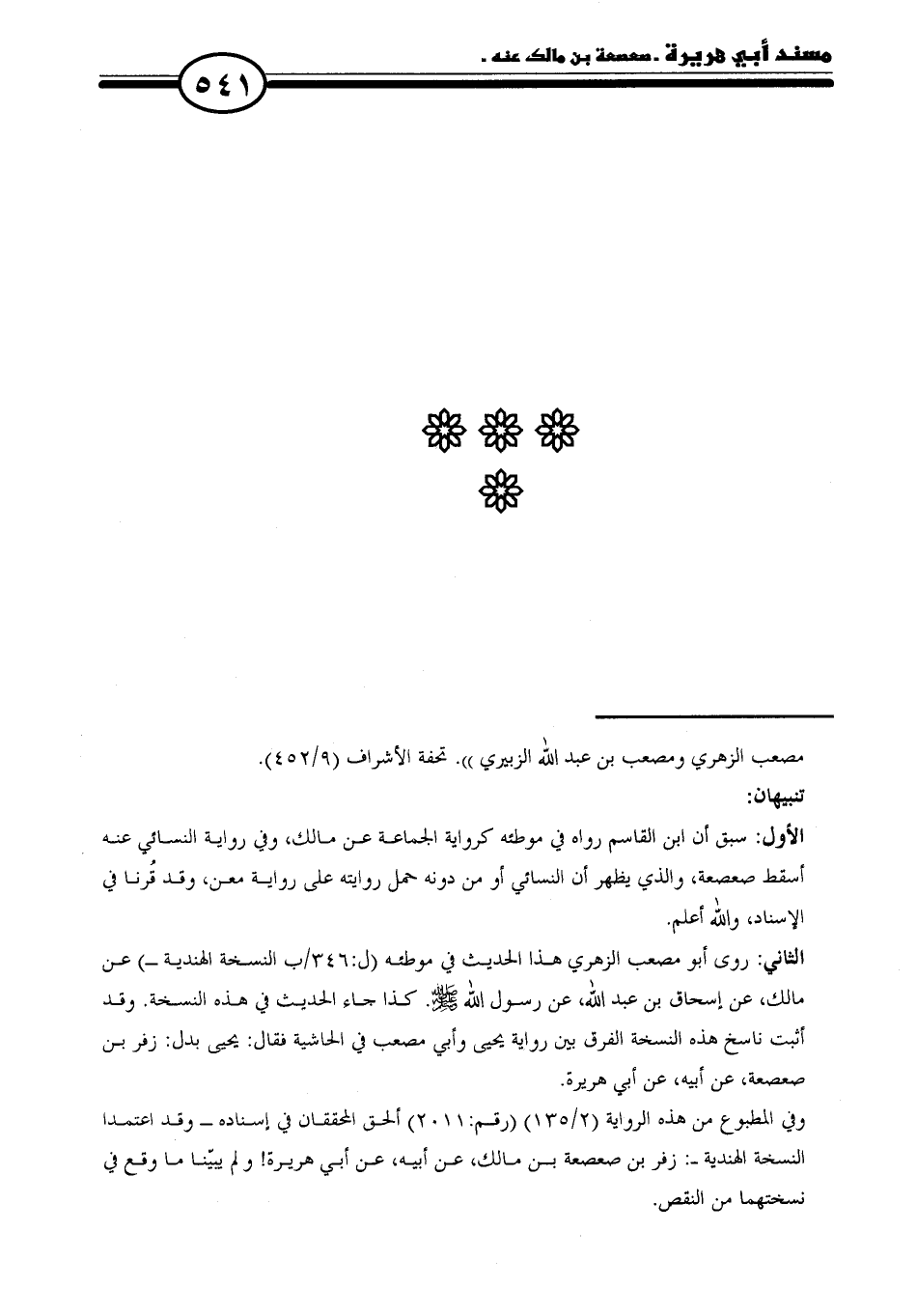 الثاني: روى أبو مصعب الزهريّ هذا الحديث في موطئه (ل: ٣٤٦/ ب النسخة الهندية-) عن مالك، عن إسحاق بن عبد الله، عن رسول الله - صلى الله عليه وسلم -. كذا جاء الحديث في هذه النسخة. وقد أثبت ناسخ هذه النسخة الفرق بين رواية يحيى وأبي مصعب في الحاشية فقال: يحيى بدل: زفر بن صعصعة، عن أبيه، عن أبي هريرة.