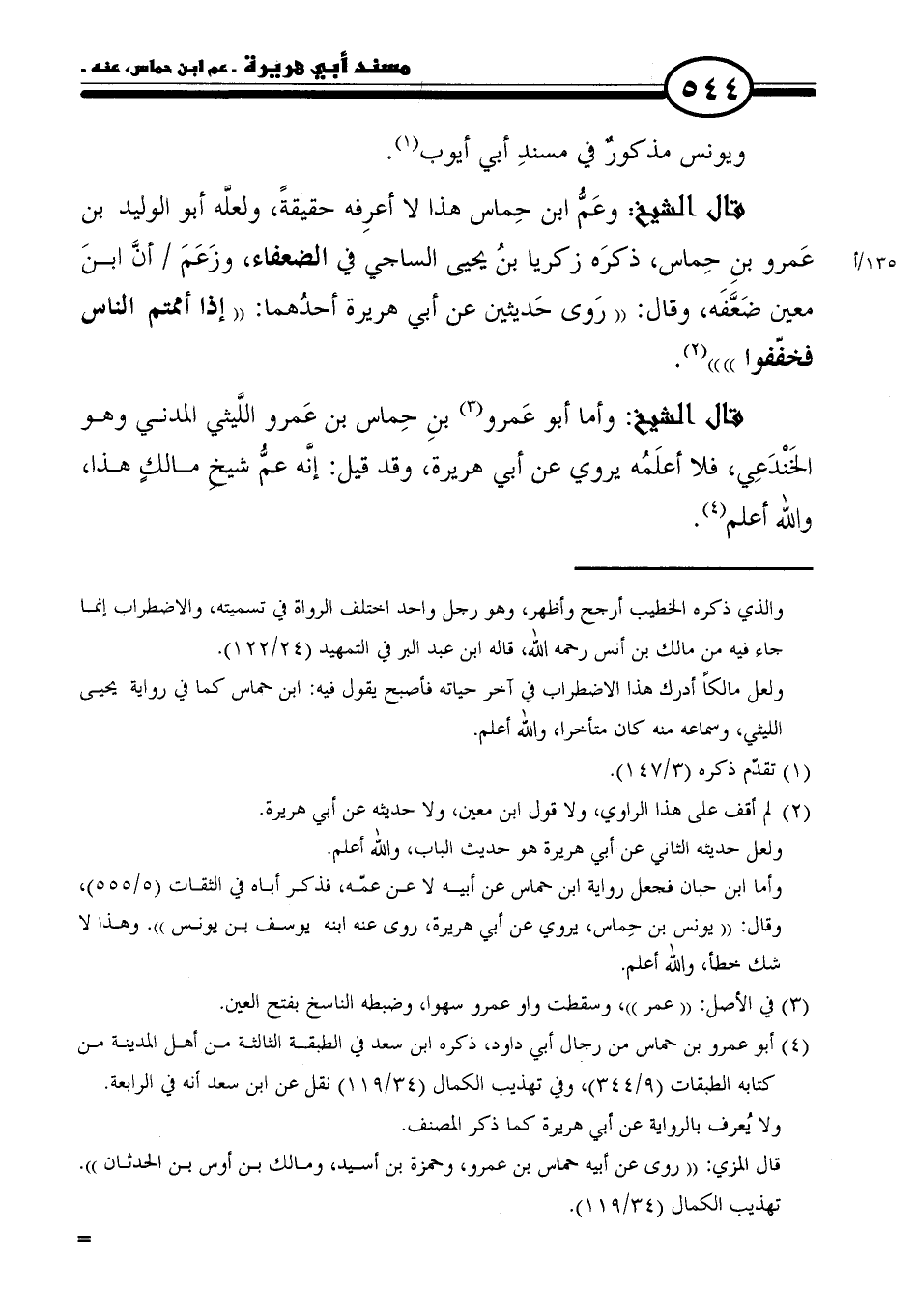 قال الشيخ: وأما أبو عَمرو (٣) بنِ حِماس بن عَمرو اللَّيثي المدني وهو الخَنْدَعِي، فلا أعلَمُه يروي عن أبي هريرة، وقد قيل: إنَّه عمُّ شيخِ مالكٍ هذا، والله أعلم (٤).