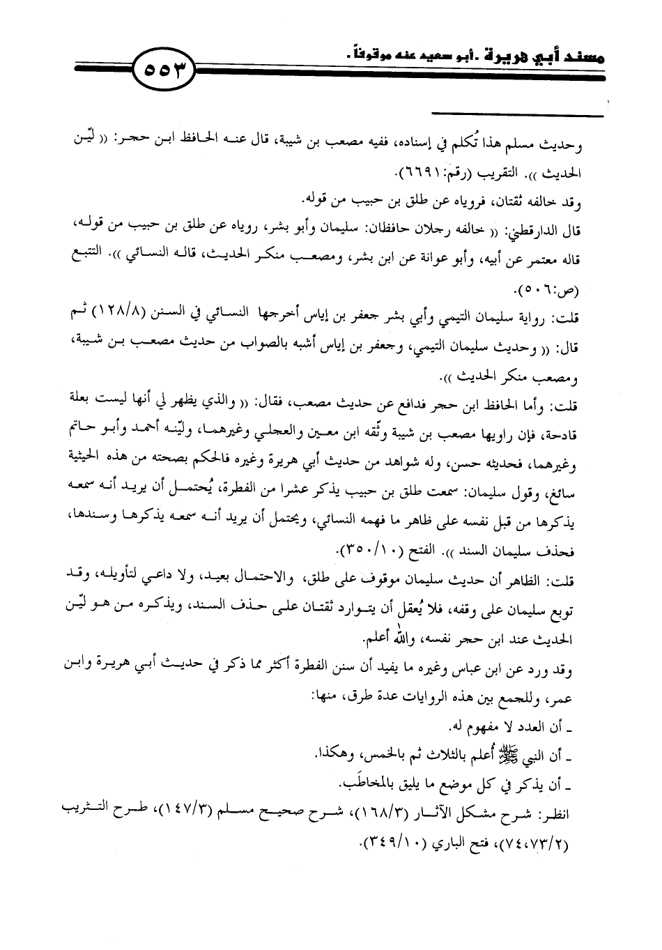 = وحديث مسلم هذا تُكلم في إسناده، ففيه مصعب بن شيبة، قال عنه الحافظ ابن حجر: "ليّن الحديث". التقريب (رقم: ٦٦٩١).
