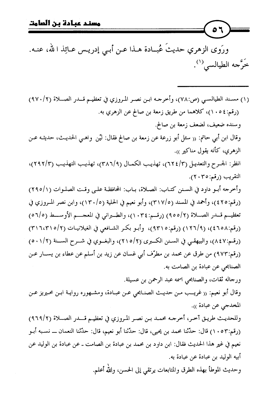 (١) مسند الطيالسي (ص: ٧٨)، وأخرحه ابن نصر المروزي في تعظيم قدر الصلاة (٢/ ٩٧٠) (رقم: ١٠٥٤)، كلاهما من طريق زمعة بن صالح عن الزهري به.