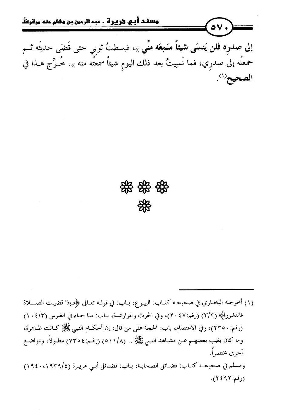 إلى صدرِه فلن يَنسَى شيئًا سَمِعَه منِّي"، فبسطتُ ثوبِي حتى قَضَى حديثَه ثم جمعتُه إلى صدرِي، فما نَسِيتُ بعد ذلك اليومِ شيئًا سمعتُه منه". خُرِّج هذا في الصحيح (١).