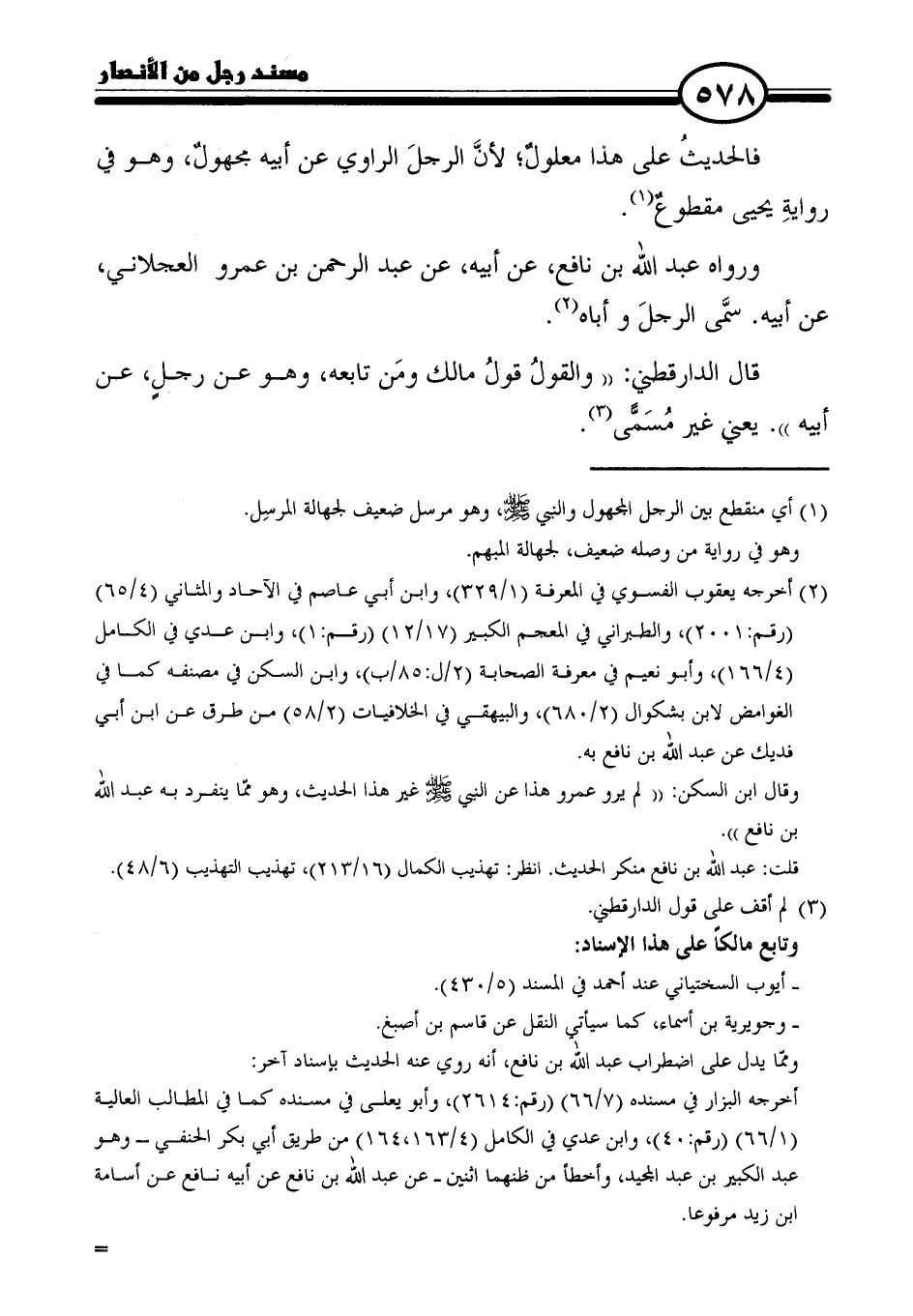 ورواه عبد الله بن نافع، عن أبيه، عن عبد الرحمن بن عمرو العجلاني، عن أبيه سمَّى الرجلَ وأباه (٢).