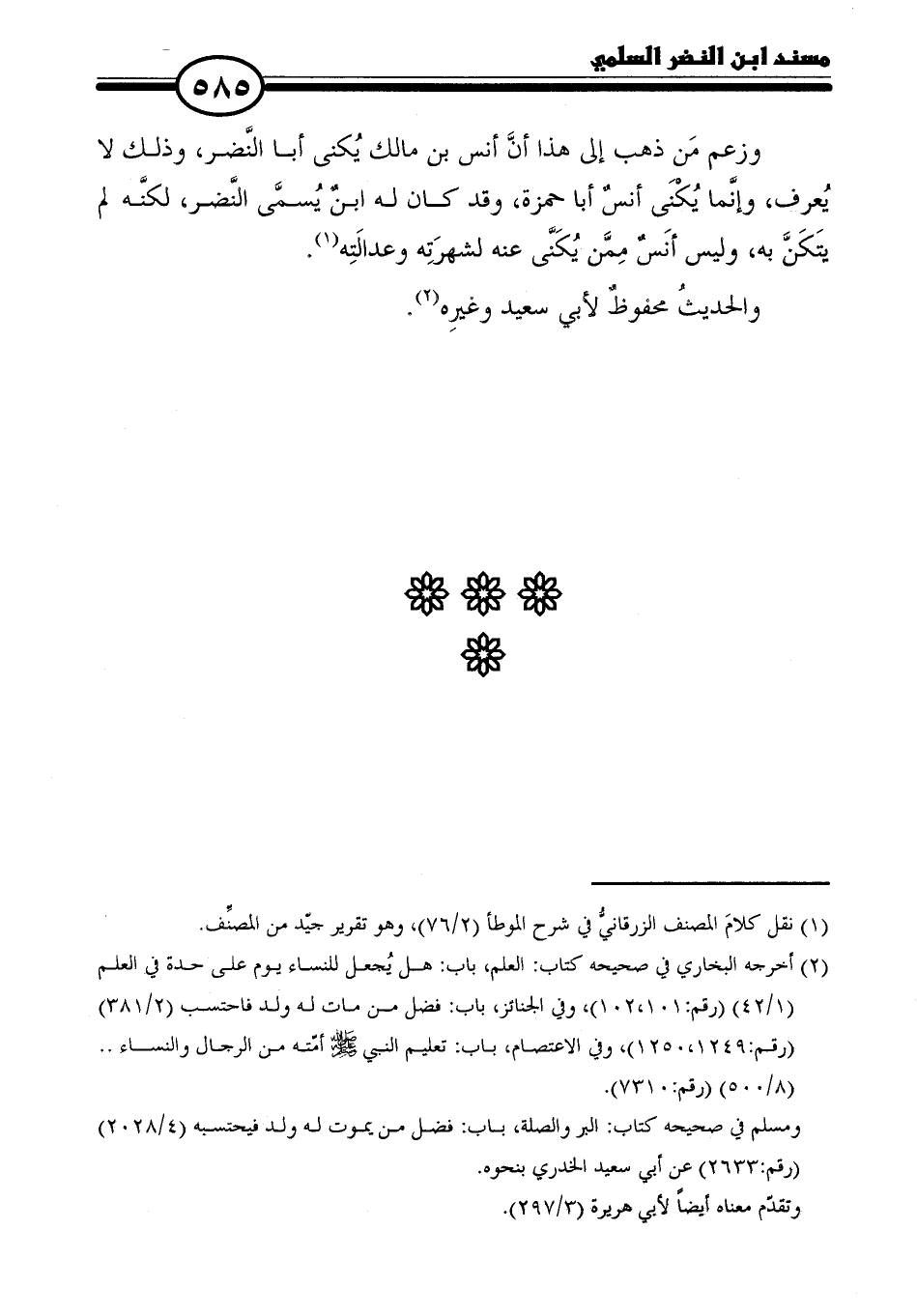 وزعم مَن ذهب إلى هذا أنَّ أنس بن مالك يُكنى أبا النَّضر، وذلك لا يُعرف، وإنَّما يُكْنَى أنسٌ أبا حمزة، وقد كان له ابنٌ يُسمَّى النَّضر، لكنَّه لم يتَكَنَّ به، وليس أنَسٌ مِمَّن يُكَنَّى عنه لشهرَتِه وعدالَتِه (١).