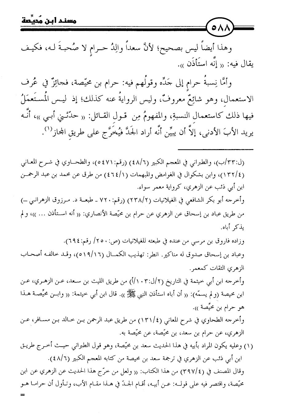 (١) وعليه يكون المراد بأبيه في هذا الحديت سعد بن محيّصة، وهو قول الطبراني حيث أخرج طريق ابن أبي ذئب عن الزهريّ في ترجمة سعد بن محيصة من كتابه المعجم الكبير (٦/ ٤٨).