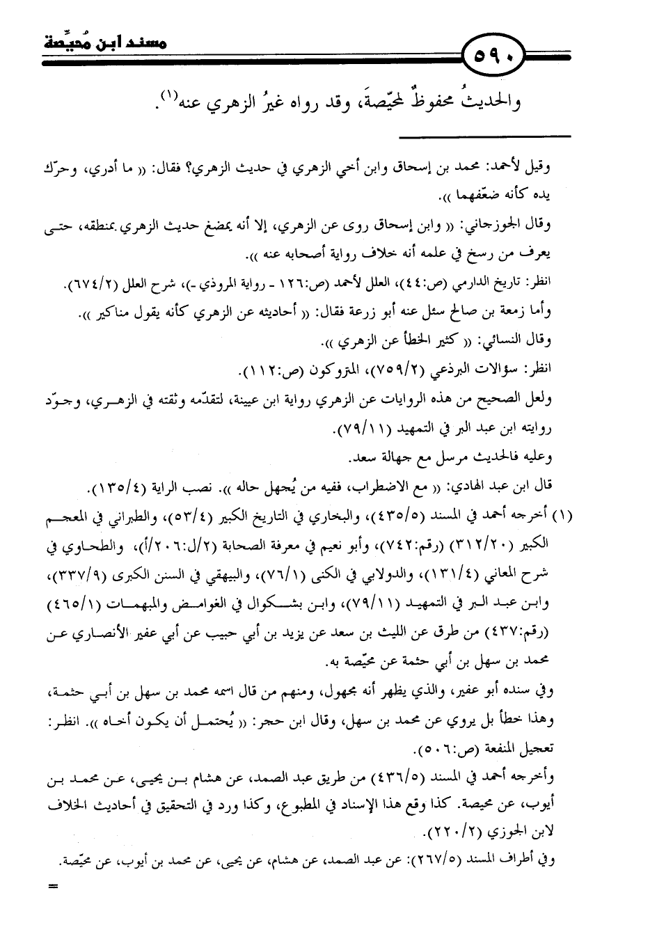 (١) أخرجه أحمد في المسند (٥/ ٤٣٥)، والبخاري في التاريخ الكبير (٤/ ٥٣)، والطبراني في المعجم الكبير (٢٠/ ٣١٢) (رقم: ٧٤٢)، وأبو نعيم في معرفة الصحابة (٢/ ل: ٢٠٦/ أ)، والطحاوي في شرح المعاني (٤/ ١٣١)، والدولابي في الكنى (١/ ٧٦)، والبيهقي في السنن الكبرى (٩/ ٣٣٧)، وابن عبد البر في التمهيد (١١/ ٧٩)، وابن بشكوال في الغوامض والمبهمات (١/ ٤٦٥) (رقم: ٤٣٧) من طرق عن الليث بن سعد عن يزيد بن أبي حبيب عن أبي عفير الأنصاري عن محمد بن سهل بن أبي حثمة عن محيّصة به.