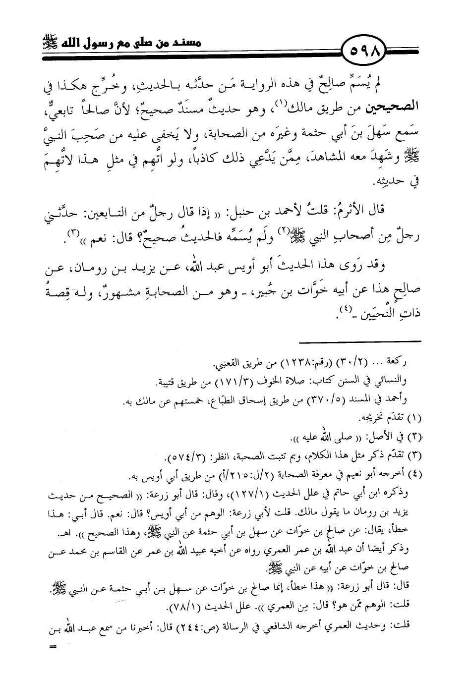 وقد رَوى هذا الحديثَ أبو أويس عبد الله، عن يزيد بن رومان، عن صالِحٍ هذا عن أبيه خَوَّات بن جُبير، -وهو من الصحابةِ مشهورٌ، وله قِصةُ ذاتِ النِّحيَين- (٤).