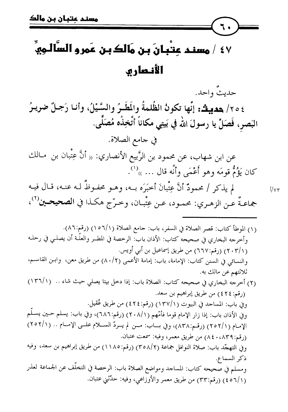 ٤٧/ مسند عِتْبانَ بن مَالك بن عَمرو السَّالمِيِّ الأنصاري