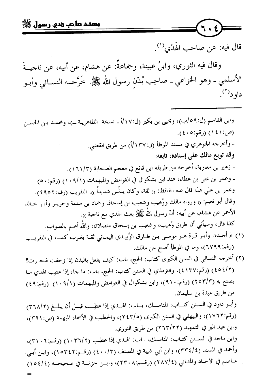 وقال فيه الثوري، وابنُ عيينة، وجماعةٌ: عن هشام، عن أبيه، عن ناجيةَ الأسلمي -وهو الخزاعي- صاحِب بُدْن رسول الله - صلى الله عليه وسلم -. خَرَّجه النسائي وأبو داود (٢).