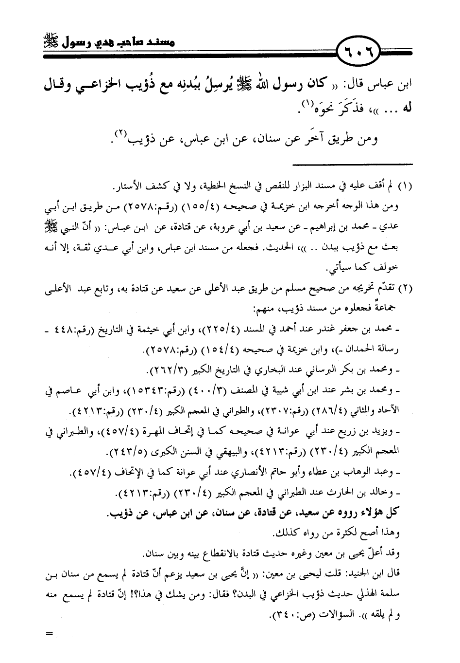 ومن هذا الوجه أخرجه ابن خزيمة في صحيحه (٤/ ١٥٥) (رقم: ٢٥٧٨) من طريق ابن أبي عدي -محمَّد بن إبراهيم- عن سعيد بن أبي عروبة، عن قتادة، عن ابن عباس: "أن النبي - صلى الله عليه وسلم - بعث مع ذؤيب ببدن .. "، الحديث. فجعله من مسند ابن عباس، وابن أبي عدي ثقة، إلا أنه خولف كما سيأتي.