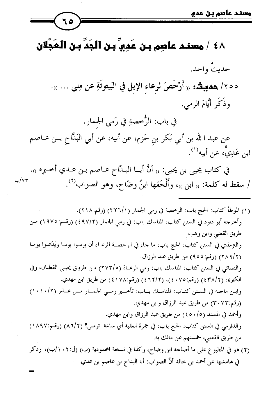 ٢٥٥/ حديث: "أَرْخَصَ لرِعاءِ الإبِل في البَيتوتَةِ عن مِنى ... ".