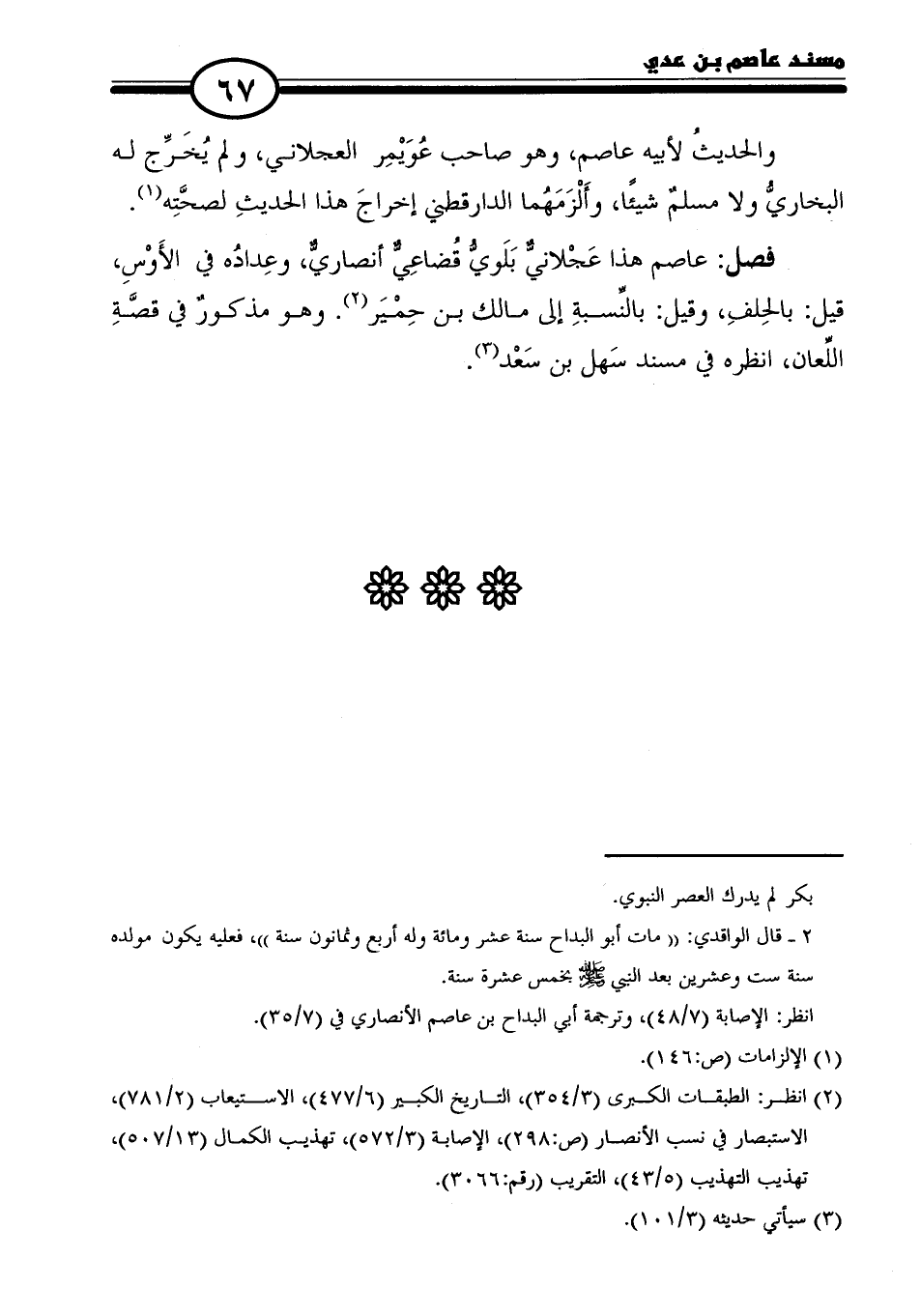 فصل: عاصم هذا عَجْلانيٌّ بَلَويُّ قُضاعِيٌّ أنصاريٌّ، وعِدادُه في الأَوْسِ، قيل: بالحِلفِ، وقيل: بالنِّسبةِ إلى مالك بن حِمْيَر (٢). وهو مذكورٌ في قصَّةِ اللِّعان، انظره في مسند سَهل بن سَعْد (٣).