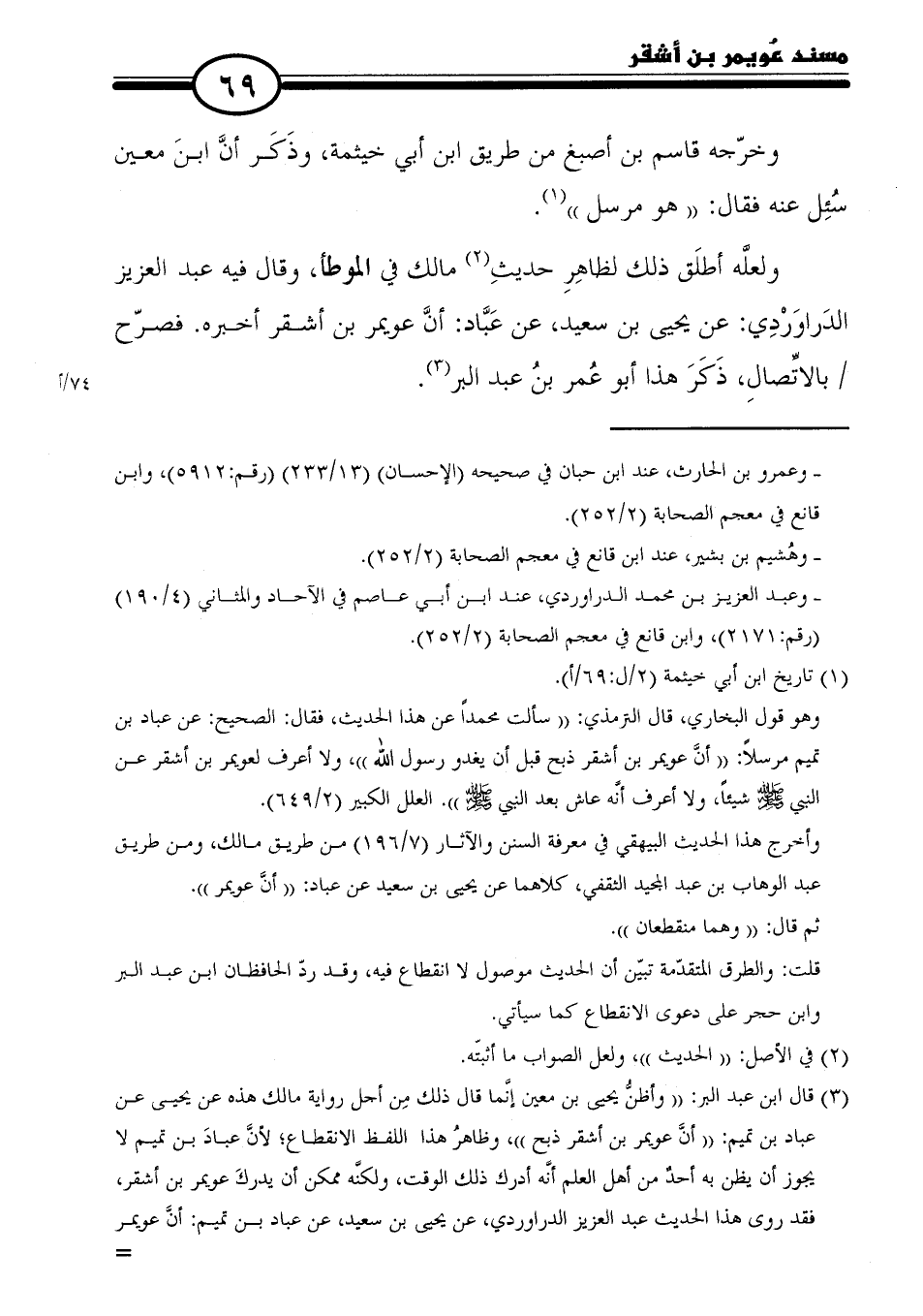 (٣) قال ابن عبد البر: "وأظنُّ يحيى بن معين إنَّما قال ذلك مِن أجل رواية مالك هذه عن يحيى عن عباد بن تميم: "أنَّ عويمر بن أشقر ذبح"، وظاهرُ هذا اللفظ الانقطاع؛ لأنَّ عبادَ بن تميم لا يجوز أن يظن به أحدٌ من أهل العلم أنَّه أدرك ذلك الوقت، ولكنه ممكن أن يدركَ عويمر بن أشقر، فقد روى هذا الحديث عبد العزيز الدراوردي، عن يحيى بن سعيد، عن عباد بن تميم: أنَّ عويمر =