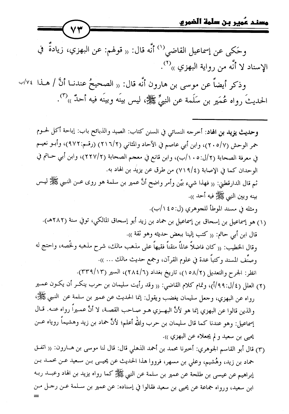 (٢) العلل (٤ /ل: ٩٩ / أ)، وتمام كلام القاضي: "وقد رأيت سليمان بن حرب ينكر أن يكون عمير رواه عن البهزي، وجعل سليمان يغضب ويقول: إنما الحديث عن عمير بن سلمة عن النبي - صلى الله عليه وسلم -، والذين قالوا عن البهزي إنما هو لأنَّ البهزي هو صاحب القصة، لا أنَّ عميرًا رواه عنه. قال إسماعيل: وهو عندنا كما قال سليمان بن حرب والله أعلم؛ لأنَّ حماد بن زيد وهشيمًا روياه عن يحيى بن سعيد ولم يجعلاه عن البهزي".