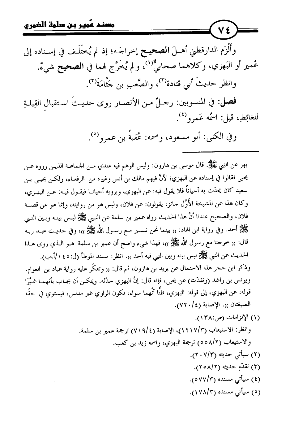 = بهز عن النبي - صلى الله عليه وسلم -. قال موسى بن هارون: وليس الوهم فيه عندي من الجماعة الذين رووه عن يحيى فقالوا في إسناده عن البهزي؛ لأنَّ فيهم مالك بن أنس وغيره من الرفعاء، ولكن يحيى بن سعيد كان يحدّث به أحيانًا فلا يقول فيه: عن البهزي، ويرويه أحيانا فيقول فيه: عن البهزي، وكان هذا عن المشيخة الأُوَّل جائز، يقولون: عن فلان، وليس هو من روايته، وإنما هو عن قصة فلان، والصحيح عندنا أنَّ هذا الحديث رواه عمير بن سلمة عن النبي - صلى الله عليه وسلم - ليس بينه وبين النبي - صلى الله عليه وسلم - أحد. وفي رواية ابن الهاد: "بينما نحن نسير مع رسول الله - صلى الله عليه وسلم - "، وفي حديث عبد ربه قال: "خرجنا مع رسول الله - صلى الله عليه وسلم - "، فهذا شيء واضح أن عمير بن سلمة هو الذي روى هذا الحديث عن النبي - صلى الله عليه وسلم - ليس بينه وبين النبي فيه أحد". انظر: مسند الموطأ (ل: ١٤٥ /أ، ب).