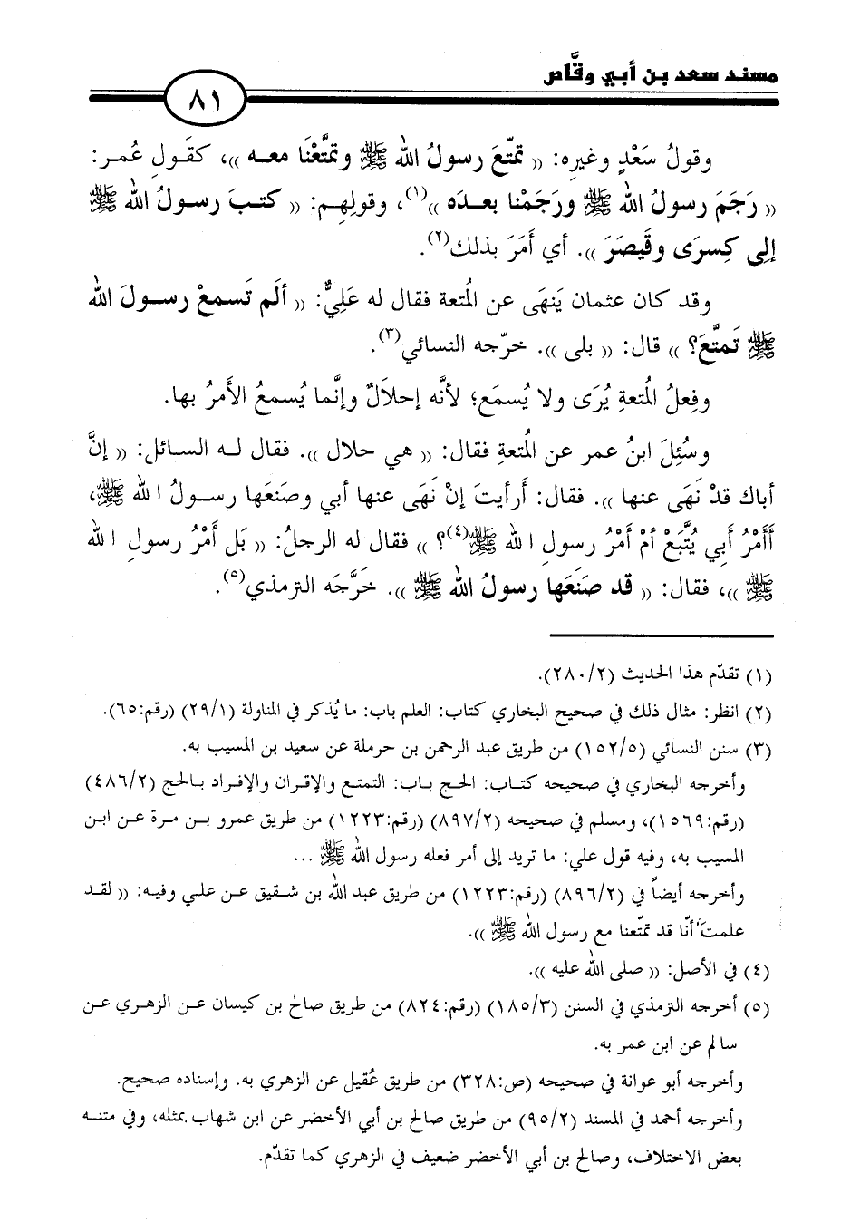 وقد كان عثمان يَنهَى عن المُتعة فقال له عَلِيٌّ: "ألَم تَسمعْ رسولَ الله - صلى الله عليه وسلم - تَمتَّعَ؟ " قال: "بلى". خرّجه النسائي (٣).