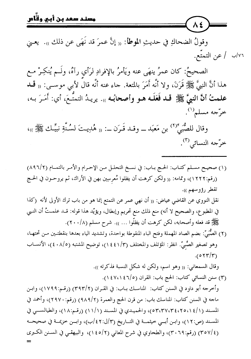 وقولُ الضحاكِ في حديثِ الموطأ: "إنَّ عمرَ قد نَهَى عن ذلك". يعني عن التمتّع.