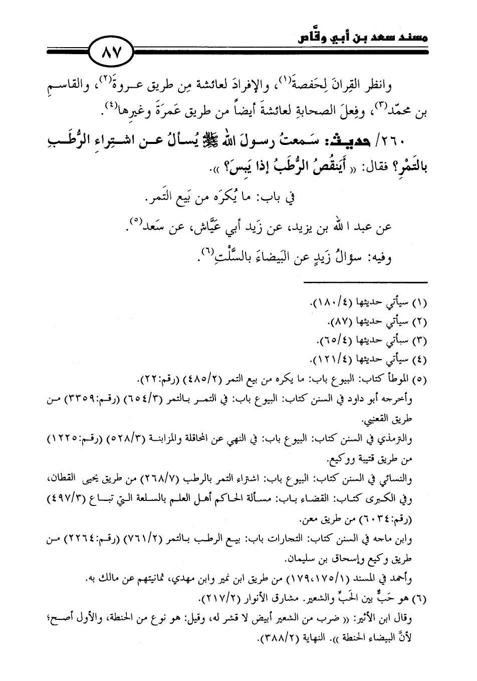 ٢٦٠ /حديث: سَمعتُ رسولَ الله - صلى الله عليه وسلم - يُسألُ عن اشتِراءِ الرُّطَبِ بالتَمْرِ؟ فقال: "أَيَنقُصُ الرُّطَبُ إذا يَبِسَ؟ ".