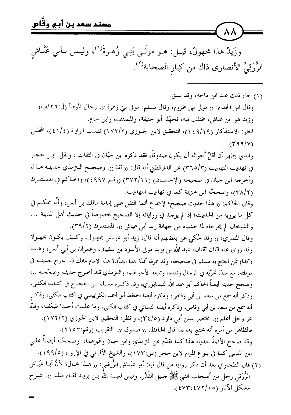 وقال المنذري: "وقد حُكي عن بعضهم أنه قال: زيد أبو عياش مجهول، وكيف يكون مجهولا وقد روى عنه اثنان ثقتان، عبد الله بن يزيد مولى الأسود بن سفيان، وعمران بن أبي أنس، وهما (كذا) ثمن احتج به مسلم في صحيحه، وقد عرفه أئمّة هذا الشأن؟ هذا الإمام مالك قد أخرج حديثه في موطئه، مع شدّة تحرّيه في الرجال ونقده، وتتبعه لأحوالهم، والترمذي قد أخرج حديثه وصحّحه .. ، وصحح حديثه أيضًا الحاكم اُبو عبد الله النيسابوري، وقد ذكره مسلم بن الحجاج في كتاب الكنى، وذكر أنه سمع من سعد بن أبي وقاص، وذكره أيضا الحافظ أبو أحمد الكرابيسي في كتاب الكنى، وذكر أنه سمع من سعد بن أبي وقاص، وذكره أيضا النسائي في كتاب الكنى، وما علمت أحدا ضغفه، والله عز وجل أعلم" بمختصر سنن أبي داود (٥/ ٣٤)، وانظر: التحقيق لابن الجوزي (٢/ ١٧٢).