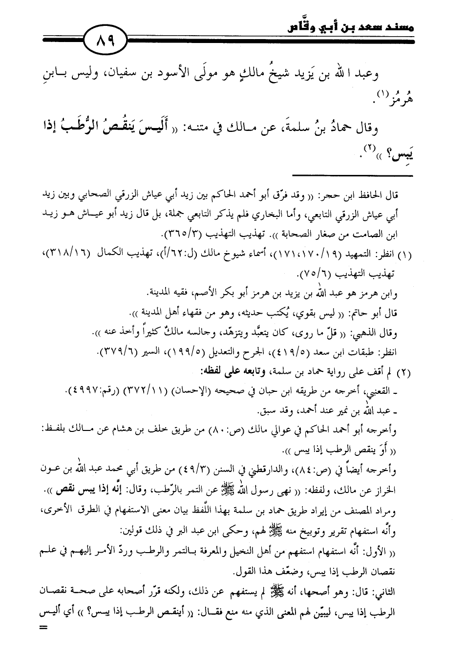 وقال حمادُ بنُ سلمةَ، عن مالك في متنه: "أَلَيسَ يَنقصُ الرُّطَبُ إذا يَبِس؟ " (٢).