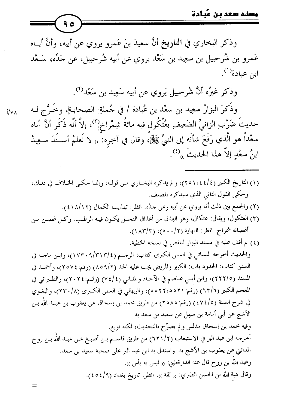 وذَكرَ البزارُ سعِيد بن سعْد بن عُبادة في جُملةِ الصحابةِ، وخَرَّج له حديثَ ضَرْبِ الزِانيِّ الضَعيفِ بعُثْكُولٍ فيه مائةُ شِمْراخٍ (٣)، إلاَّ أنَّه ذَكَر أنَّ أباه سعْدًا هو الَّذي رَفعَ شأنَه إلى النبيِّ - صلى الله عليه وسلم -، وقال في آخِرِه: "لا نَعلمُ أسنَدَ سعِيدُ بنُ سعْدٍ إلاّ هذا الحديثَ" (٤).