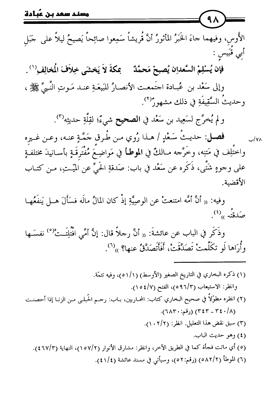 وفيه: "أنَّ أمَّه امتنعتْ عن الوصِيَّةِ إذْ كان المالُ مالَه فسَأَلَ هل يَنفَعُها صَدقته" (٤).