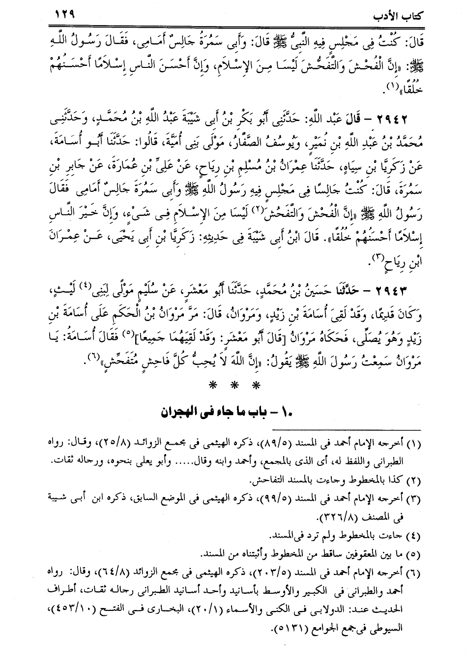 2942 - قَالَ عَبْد اللَّهِ: حَدَّثَنِى أَبُو بَكْرِ بْنُ أَبِى شَيْبَةَ عَبْدُ اللَّهِ بْنُ مُحَمَّدٍ، وَحَدَّثَنِى مُحَمَّدُ بْنُ عَبْدِ اللَّهِ بْنِ نُمَيْرٍ، وَيُوسُفُ الصَّفَّارُ، مَوْلَى بَنِى أُمَيَّةَ، قَالُوا: حَدَّثَنَا أَبُو أُسَامَةَ، عَنْ زَكَرِيَّا بْنِ سِيَاهٍ، حَدَّثَنَا عِمْرَانُ بْنُ مُسْلِمِ بْنِ رِيَاحٍ، عَنْ عَلِىِّ بْنِ عُمَارَةَ، عَنْ جَابِرِ بْنِ سَمُرَةَ، قَالَ: كُنْتُ جَالِسًا فِى مَجْلِسٍ فِيهِ رَسُولُ اللَّهِ صلى الله عليه وسلم وَأَبِى سَمُرَةَ جَالِسٌ أَمَامِى فَقَالَ رَسُولُ اللَّهِ صلى الله عليه وسلم إِنَّ الْفُحْشَ وَالتَّفَحُشَ لَيْسَا مِنَ الإِسْلاَمِ فِى شَىْءٍ، وَإِنَّ خَيْرَ النَّاسِ إِسْلاَمًا أَحْسَنُهُمْ خُلُقًا. قَالَ ابْنُ أَبِى شَيْبَةَ فِى حَدِيثِهِ: زَكَرِيَّا بْنِ أَبِى يَحْيَى، عَنْ عِمْرَانَ ابْنِ رِيَاحٍ.