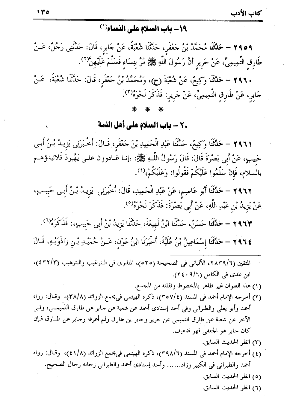 2959 - حَدَّثَنَا مُحَمَّدُ بْنُ جَعْفَرٍ، حَدَّثَنَا شُعْبَةُ، عَنْ جَابِرٍ، قَالَ: حَدَّثَنِى رَجُلٌ، عَنْ طَارِقٍ التَّمِيمِىِّ، عَنْ جَرِيرٍ أَنَّ رَسُولَ اللَّهِ صلى الله عليه وسلم مَرَّ بِنِسَاءٍ فَسَلَّمَ عَلَيْهِنَّ.