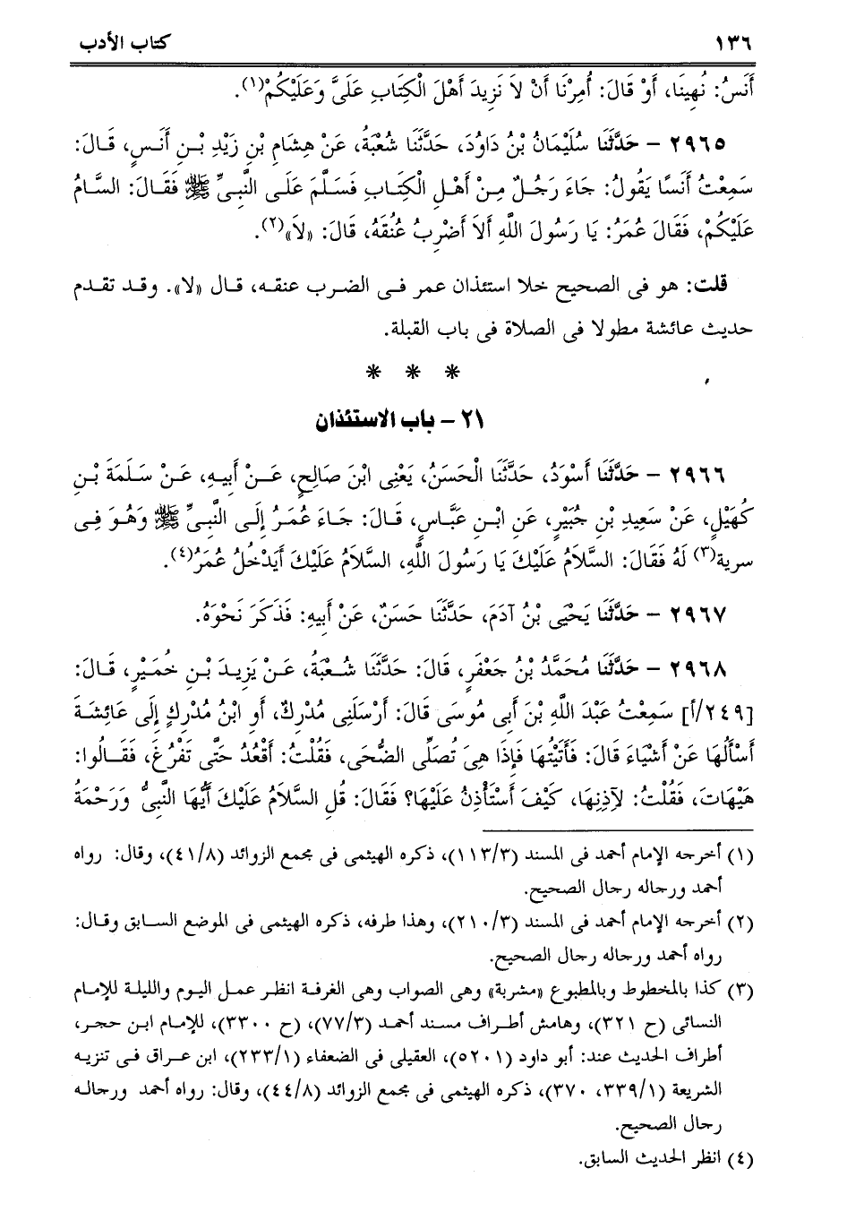2966 - حَدَّثَنَا أَسْوَدُ، حَدَّثَنَا الْحَسَنُ، يَعْنِى ابْنَ صَالِحٍ، عَنْ أَبِيهِ، عَنْ سَلَمَةَ بْنِ كُهَيْلٍ، عَنْ سَعِيدِ بْنِ جُبَيْرٍ، عَنِ ابْنِ عَبَّاسٍ، قَالَ: جَاءَ عُمَرُ إِلَى النَّبِىِّ صلى الله عليه وسلم وَهُوَ فِى سرية لَهُ فَقَالَ: السَّلاَمُ عَلَيْكَ يَا رَسُولَ اللَّهِ، السَّلاَمُ عَلَيْكَ أَيَدْخُلُ عُمَرُ.