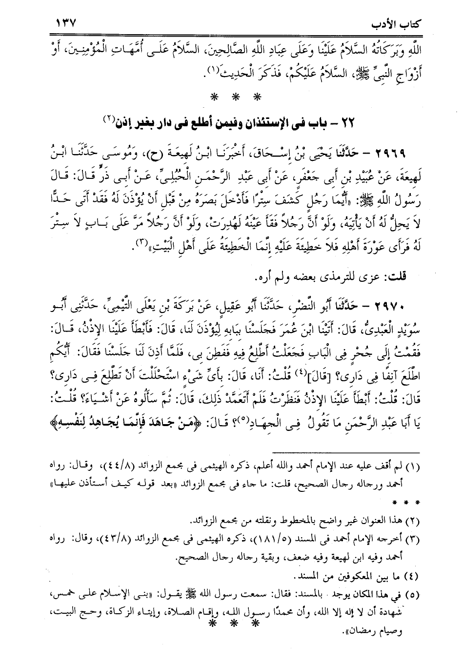 2970 - حَدَّثَنَا أَبُو النَّضْرِ، حَدَّثَنَا أَبُو عَقِيلٍ، عَنْ بَرَكَةَ بْنِ يَعْلَى التَّيْمِىِّ، حَدَّثَنِى أَبُو سُوَيْدٍ الْعَبْدِىُّ، قَالَ: أَتَيْنَا ابْنَ عُمَرَ فَجَلَسْنَا بِبَابِهِ لِيُؤْذَنَ لَنَا، قَالَ: فَأَبْطَأَ عَلَيْنَا الإِذْنُ، قَالَ: فَقُمْتُ إِلَى جُحْرٍ فِى الْبَابِ فَجَعَلْتُ أَطَّلِعُ فِيهِ فَفَطِنَ بِى، فَلَمَّا أَذِنَ لَنَا جَلَسْنَا فَقَالَ: أَيُّكُمِ اطَّلَعَ آنِفًا فِى دَارِى؟ [قَالَ] قُلْتُ: أَنَا، قَالَ: بِأَىِّ شَىْءٍ اسْتَحْلَلْتَ أَنْ تَطَّلِعَ فِى دَارِى؟ قَالَ: قُلْتُ: أَبْطَأَ عَلَيْنَا الإِذْنُ فَنَظَرْتُ فَلَمْ أَتَعَمَّدْ ذَلِكَ، قَالَ: ثُمَّ سَأَلُوهُ عَنْ أَشْيَاءَ؟ قُلْتُ: يَا أَبَا عَبْدِ الرَّحْمَنِ مَا تَقُولُ فِى الْجِهَادِ؟ قَالَ: {مَنْ جَاهَدَ فَإِنَّمَا يُجَاهِدُ لِنَفْسِهِ} -[138]-[العنكبوت] .