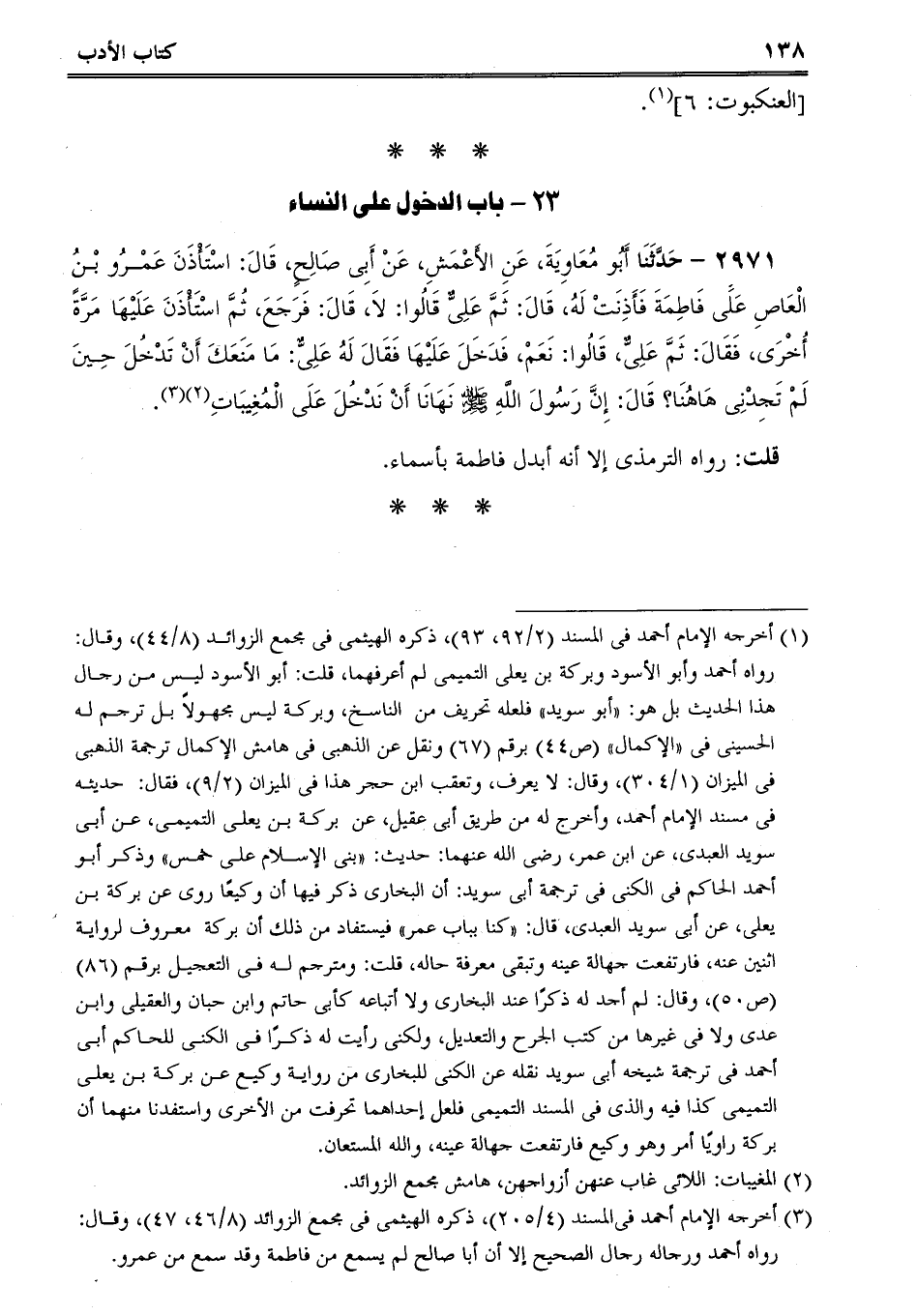 2971 - حَدَّثَنَا أَبُو مُعَاوِيَةَ، عَنِ الأَعْمَشِ، عَنْ أَبِى صَالِحٍ، قَالَ: اسْتَأْذَنَ عَمْرُو بْنُ الْعَاصِ عَلَى فَاطِمَةَ فَأَذِنَتْ لَهُ، قَالَ: ثَمَّ عَلِىٌّ قَالُوا: لاَ، قَالَ: فَرَجَعَ، ثُمَّ اسْتَأْذَنَ عَلَيْهَا مَرَّةً أُخْرَى، فَقَالَ: ثَمَّ عَلِىٌّ، قَالُوا: نَعَمْ، فَدَخَلَ عَلَيْهَا فَقَالَ لَهُ عَلِىٌّ: مَا مَنَعَكَ أَنْ تَدْخُلَ حِينَ لَمْ تَجِدْنِى هَاهُنَا؟ قَالَ: إِنَّ رَسُولَ اللَّهِ صلى الله عليه وسلم نَهَانَا أَنْ نَدْخُلَ عَلَى الْمُغِيبَاتِ.