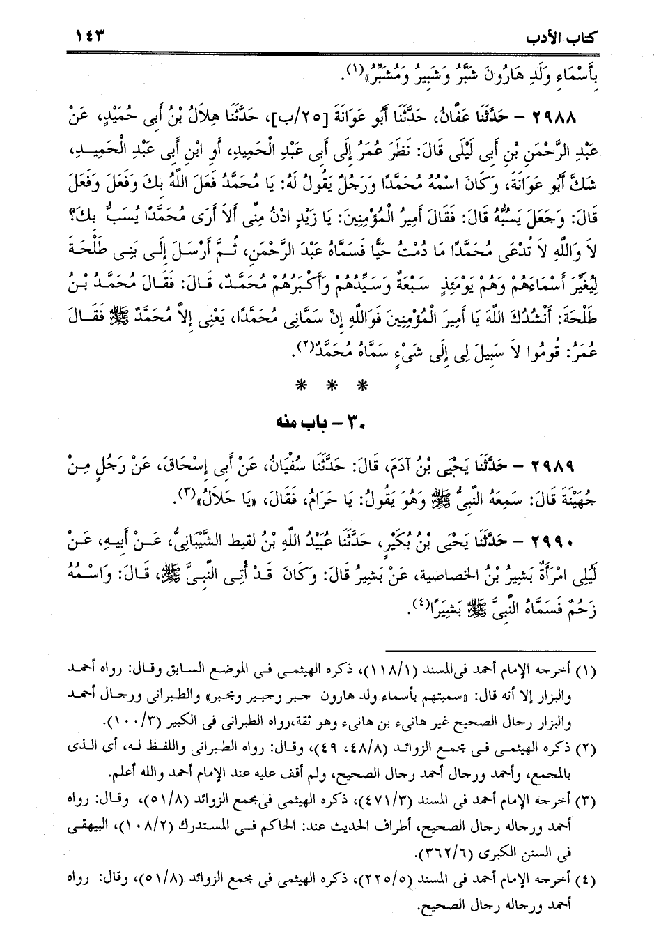 2988 - حَدَّثَنَا عَفَّانُ، حَدَّثَنَا أَبُو عَوَانَةَ، حَدَّثَنَا هِلاَلُ بْنُ أَبِى حُمَيْدٍ، عَنْ عَبْدِ الرَّحْمَنِ بْنِ أَبِى لَيْلَى قَالَ: نَظَرَ عُمَرُ إِلَى أَبِى عَبْدِ الْحَمِيدِ، أَوِ ابْنِ أَبِى عَبْدِ الْحَمِيدِ، شَكَّ أَبُو عَوَانَةَ، وَكَانَ اسْمُهُ مُحَمَّدًا وَرَجُلٌ يَقُولُ لَهُ: يَا مُحَمَّدُ فَعَلَ اللَّهُ بِكَ وَفَعَلَ وَفَعَلَ قَالَ: وَجَعَلَ يَسُبُّهُ قَالَ: فَقَالَ أَمِيرُ الْمُؤْمِنِينَ: يَا زَيْدٍ ادْنُ مِنِّى أَلاَ أَرَى مُحَمَّدًا يُسَبُّ بِكَ؟ لاَ وَاللَّهِ لاَ تُدْعَى مُحَمَّدًا مَا دُمْتُ حَيًّا فَسَمَّاهُ عَبْدَ الرَّحْمَنِ، ثُمَّ أَرْسَلَ إِلَى بَنِى طَلْحَةَ لِيُغَيِّرَ أَسْمَاءَهُمْ وَهُمْ يَوْمَئِذٍ سَبْعَةٌ وَسَيِّدُهُمْ وَأَكْبَرُهُمْ مُحَمَّدٌ، قَالَ: فَقَالَ مُحَمَّدُ بْنُ طَلْحَةَ: أَنْشُدُكَ اللَّهَ يَا أَمِيرَ الْمُؤْمِنِينَ فَوَاللَّهِ إِنْ سَمَّانِى مُحَمَّدًا، يَعْنِى إِلاَّ مُحَمَّدٌ صلى الله عليه وسلم فَقَالَ عُمَرُ: قُومُوا لاَ سَبِيلَ لِى إِلَى شَىْءٍ سَمَّاهُ مُحَمَّدٌ.