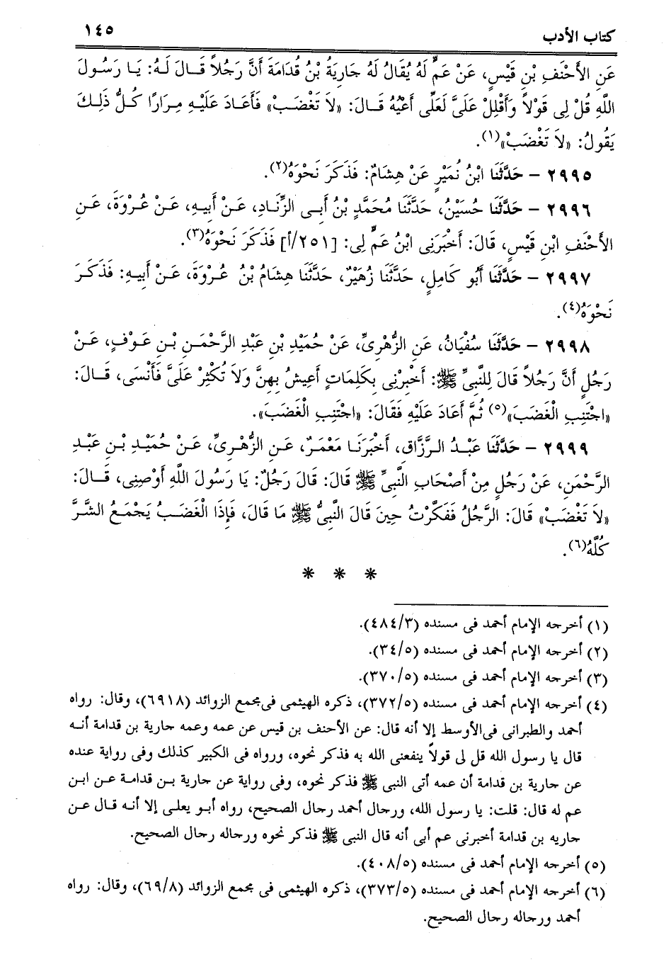 2998 - حَدَّثَنَا سُفْيَانُ، عَنِ الزُّهْرِىِّ، عَنْ حُمَيْدِ بْنِ عَبْدِ الرَّحْمَنِ بْنِ عَوْفٍ، عَنْ رَجُلٍ أَنَّ رَجُلاً قَالَ لِلنَّبِىِّ صلى الله عليه وسلم: أَخْبِرْنِى بِكَلِمَاتٍ أَعِيشُ بِهِنَّ وَلاَ تُكْثِرْ عَلَىَّ فَأَنْسَى، قَالَ: اجْتَنِبِ الْغَضَبَ ثُمَّ أَعَادَ عَلَيْهِ فَقَالَ: اجْتَنِبِ الْغَضَبَ.