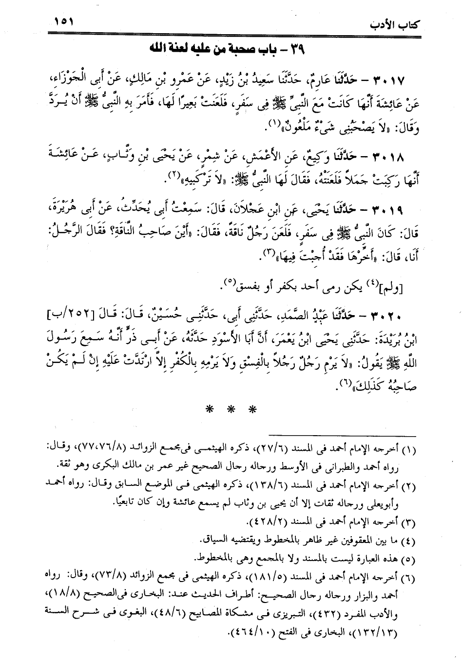 3017 - حَدَّثَنَا عَارِمٌ، حَدَّثَنَا سَعِيدُ بْنُ زَيْدٍ، عَنْ عَمْرِو بْنِ مَالِكٍ، عَنْ أَبِى الْجَوْزَاءِ، عَنْ عَائِشَةَ أَنَّهَا كَانَتْ مَعَ النَّبِىِّ صلى الله عليه وسلم فِى سَفَرٍ، فَلَعَنَتْ بَعِيرًا لَهَا، فَأَمَرَ بِهِ النَّبِىُّ صلى الله عليه وسلم أَنْ يُرَدَّ وَقَالَ: لاَ يَصْحَبُنِى شَىْءٌ مَلْعُونٌ.