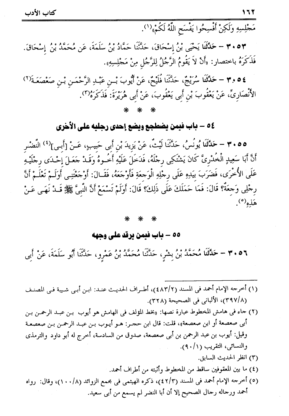 3055 - حَدَّثَنَا يُونُسُ، حَدَّثَنَا لَيْثٌ، عَنْ يَزِيدَ بْنِ أَبِى حَبِيبٍ، عَنْ [أَبِى] النَّضْرِ أَنَّ أَبَا سَعِيدٍ الْخُدْرِىَّ كَانَ يَشْتَكِى رِجْلَهُ، فَدَخَلَ عَلَيْهِ أَخُوهُ وَقَدْ جَعَلَ إِحْدَى رِجْلَيْهِ عَلَى الأُخْرَى، فَضَرَبَ بِيَدِهِ عَلَى رِجْلِهِ الْوَجِعَةِ فَأَوْجَعَهُ، فَقَالَ: أَوْجَعْتَنِى أَوَلَمْ تَعْلَمْ أَنَّ رِجْلِى وَجِعَةٌ؟ قَالَ: فَمَا حَمَلَكَ عَلَى ذَلِكَ؟ قَالَ: أَوَلَمْ تَسْمَعْ أَنَّ النَّبِىَّ صلى الله عليه وسلم قَدْ نَهَى عَنْ هَذِهِ.
