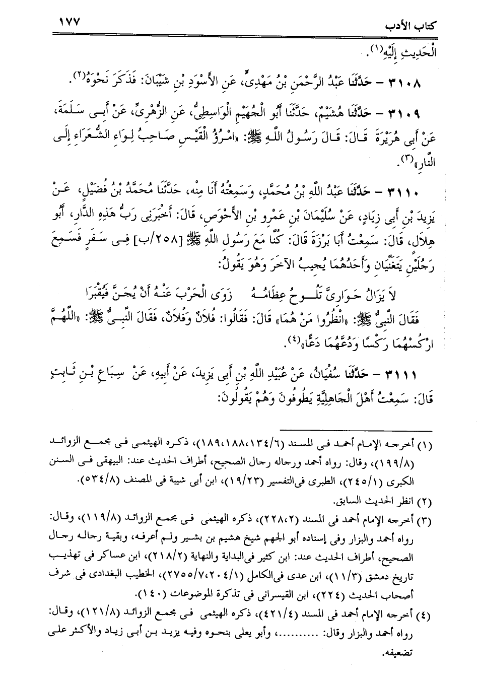 3110 - حَدَّثَنَا عَبْدُ اللَّهِ بْنُ مُحَمَّدٍ، وَسَمِعْتُهُ أَنَا مِنْه، حَدَّثَنَا مُحَمَّدُ بْنُ فُضَيْلٍ، عَنْ يَزِيدَ بْنِ أَبِى زِيَادٍ، عَنْ سُلَيْمَانَ بْنِ عَمْرِو بْنِ الأَحْوَصِ، قَالَ: أَخْبَرَنِى رَبُّ هَذِهِ الدَّارِ، أَبُو هِلاَلٍ، قَالَ: سَمِعْتُ أَبَا بَرْزَةَ قَالَ: كُنَّا مَعَ رَسُولِ اللَّهِ صلى الله عليه وسلم فِى سَفَرٍ فَسَمِعَ رَجُلَيْنِ يَتَغَنَّيَانِ وَأَحَدُهُمَا يُجِيبُ الآخَرَ وَهُوَ يَقُولُ: