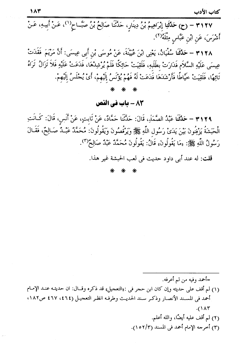 3129 - حَدَّثَنَا عَبْدُ الصَّمَدِ، قَالَ: حَدَّثَنَا حَمَّادٌ، عَنْ ثَابِتٍ، عَنْ أَنَسٍ، قَالَ: كَانَتِ الْحَبَشَةُ يَزْفِنُونَ بَيْنَ يَدَىْ رَسُولِ اللَّهِ صلى الله عليه وسلم وَيَرْقُصُونَ وَيَقُولُونَ: مُحَمَّدٌ عَبْدٌ صَالِحٌ، فَقَالَ رَسُولُ اللَّهِ صلى الله عليه وسلم: مَا يَقُولُونَ قَالُ: يَقُولُونَ مُحَمَّدٌ عَبْدٌ صَالِحٌ.