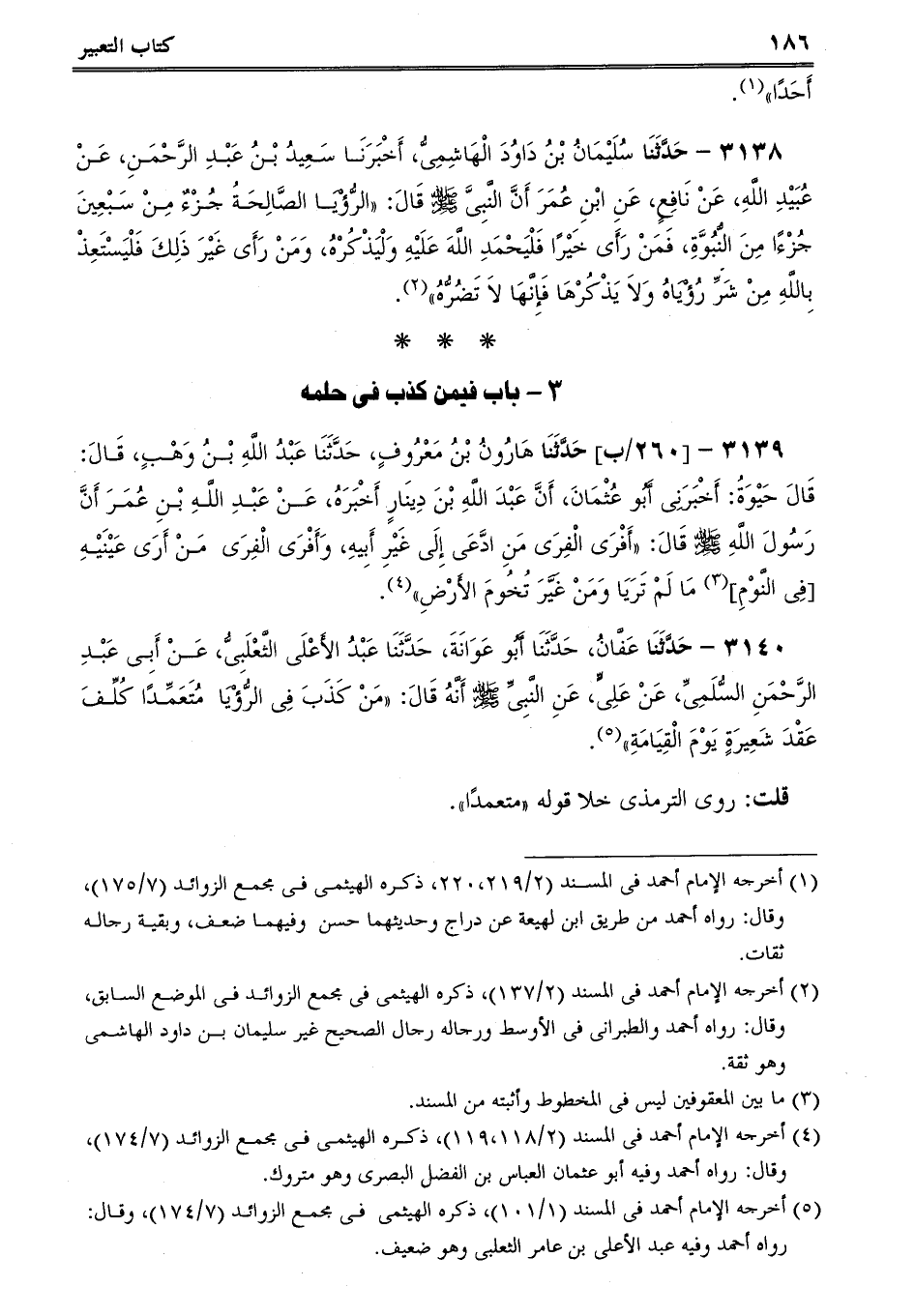 3140 - حَدَّثَنَا عَفَّانُ، حَدَّثَنَا أَبُو عَوَانَةَ، حَدَّثَنَا عَبْدُ الأَعْلَى الثَّعْلَبِىُّ، عَنْ أَبِى عَبْدِ الرَّحْمَنِ السُّلَمِىِّ، عَنْ عَلِىٍّ، عَنِ النَّبِىِّ صلى الله عليه وسلم أَنَّهُ قَالَ: مَنْ كَذَبَ فِى الرُّؤْيَا مُتَعَمِّدًا كُلِّفَ عَقْدَ شَعِيرَةٍ يَوْمَ الْقِيَامَةِ.