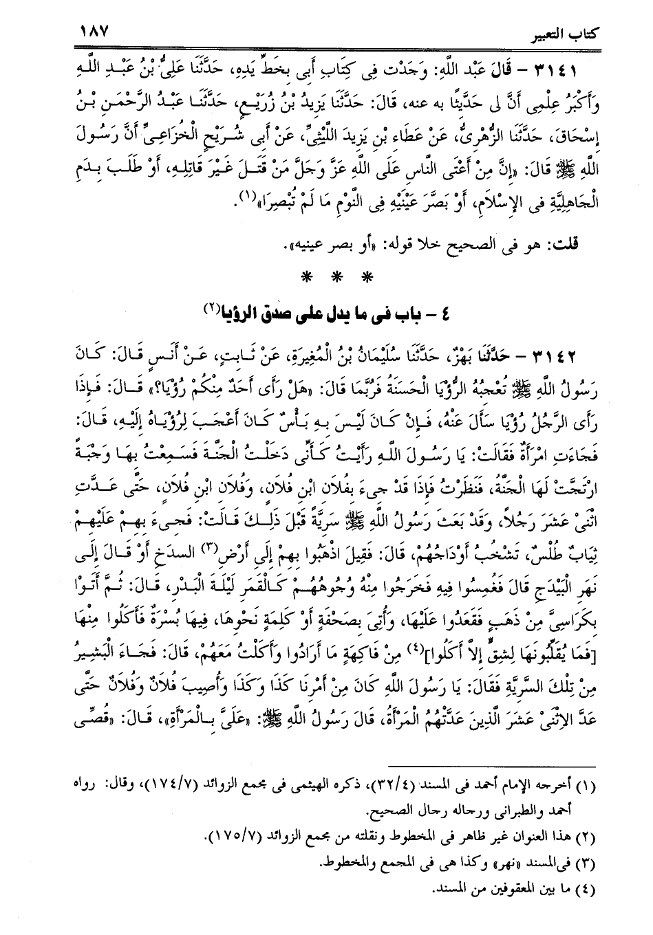 3142 - حَدَّثَنَا بَهْزٌ، حَدَّثَنَا سُلَيْمَانُ بْنُ الْمُغِيرَةِ، عَنْ ثَابِتٍ، عَنْ أَنَسٍ قَالَ: كَانَ رَسُولُ اللَّهِ صلى الله عليه وسلم تُعْجِبُهُ الرُّؤْيَا الْحَسَنَةُ فَرُبَّمَا قَالَ: هَلْ رَأَى أَحَدٌ مِنْكُمْ رُؤْيَا؟ قَالَ: فَإِذَا رَأَى الرَّجُلُ رُؤْيَا سَأَلَ عَنْهُ، فَإِنْ كَانَ لَيْسَ بِهِ بَأْسٌ كَانَ أَعْجَبَ لِرُؤْيَاهُ إِلَيْهِ، قَالَ: فَجَاءَتِ امْرَأَةٌ فَقَالَتْ: يَا رَسُولَ اللَّهِ رَأَيْتُ كَأَنِّى دَخَلْتُ الْجَنَّةَ فَسَمِعْتُ بِهَا وَجْبَةً ارْتَجَّتْ لَهَا الْجَنَّةُ، فَنَظَرْتُ فَإِذَا قَدْ جِىءَ بِفُلاَنِ ابْنِ فُلاَنٍ، وَفُلاَنِ ابْنِ فُلاَنٍ، حَتَّى عَدَّتِ اثْنَىْ عَشَرَ رَجُلاً، وَقَدْ بَعَثَ رَسُولُ اللَّهِ صلى الله عليه وسلم سَرِيَّةً قَبْلَ ذَلِكَ قَالَتْ: فَجِىءَ بِهِمْ عَلَيْهِمْ ثِيَابٌ طُلْسٌ، تَشْخُبُ أَوْدَاجُهُمْ، قَالَ: فَقِيلَ اذْهَبُوا بِهِمْ إِلَىِ أَرْضِ السدَخِ أَوْ قَالَ إِلَى نَهَرِ الْبَيْدَجِ قَالَ فَغُمِسُوا فِيهِ فَخَرَجُوا مِنْهُ وُجُوهُهُمْ كَالْقَمَرِ لَيْلَةَ الْبَدْرِ، قَالَ: ثُمَّ أَتَوْا بِكَرَاسِىَّ مِنْ ذَهَبٍ فَقَعَدُوا عَلَيْهَا، وَأُتِىَ بِصَحْفَةٍ أَوْ كَلِمَةٍ نَحْوِهَا، فِيهَا بُسْرَةٌ فَأَكَلُوا مِنْهَا [فَمَا يُقَلِّبُونَهَا لِشِقٍّ إِلاَّ أَكَلُوا] مِنْ فَاكِهَةٍ مَا أَرَادُوا وَأَكَلْتُ مَعَهُمْ، قَالَ: فَجَاءَ الْبَشِيرُ مِنْ تِلْكَ السَّرِيَّةِ فَقَالَ: يَا رَسُولَ اللَّهِ كَانَ مِنْ أَمْرِنَا كَذَا وَكَذَا وَأُصِيبَ فُلاَنٌ وَفُلاَنٌ حَتَّى عَدَّ الاِثْنَىْ عَشَرَ الَّذِينَ عَدَّتْهُمُ الْمَرْأَةُ، قَالَ رَسُولُ اللَّهِ صلى الله عليه وسلم: عَلَىَّ بِالْمَرْأَةِ، قَالَ: قُصِّى -[188]- عَلَى هَذَا رُؤْيَاكِ فَقَصَّتْ قَالَ: هُوَ كَمَا قَالَتْ لِرَسُولِ اللَّهِ صلى الله عليه وسلم.