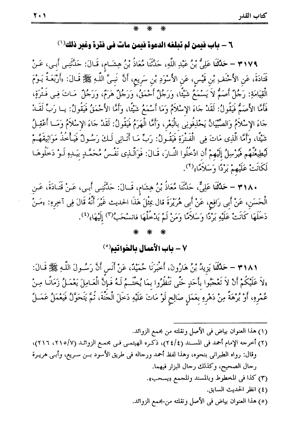 3179 - حَدَّثَنَا عَلِىُّ بْنُ عَبْدِ اللَّهِ، حَدَّثَنَا مُعَاذُ بْنُ هِشَامٍ، قَالَ: حَدَّثَنِى أَبِى، عَنْ قَتَادَةَ، عَنِ الأَحْنَفِ بْنِ قَيْسٍ، عَنِ الأَسْوَدِ بْنِ سَرِيعٍ، أَنَّ نَبِىَّ اللَّهِ صلى الله عليه وسلم قَالَ: أَرْبَعَةٌ يَوْمَ الْقِيَامَةِ: رَجُلٌ أَصَمُّ لاَ يَسْمَعُ شَيْئًا، وَرَجُلٌ أَحْمَقُ، وَرَجُلٌ هَرَمٌ، وَرَجُلٌ مَاتَ فِى فَتْرَةٍ، فَأَمَّا الأَصَمُّ فَيَقُولُ: لَقَدْ جَاءَ الإِسْلاَمُ وَمَا أَسْمَعُ شَيْئًا، وَأَمَّا الأَحْمَقُ فَيَقُولُ: يا رَبِّ لَقَدْ جَاءَ الإِسْلاَمُ وَالصِّبْيَانُ يَحْذِفُونِى بِالْبَعْرِ، وَأَمَّا الْهَرَمُ فَيَقُولُ: لَقَدْ جَاءَ الإِسْلاَمُ وَمَا أَعْقِلُ شَيْئًا، وَأَمَّا الَّذِى مَاتَ فِى الْفَتْرَةِ فَيَقُولُ: رَبِّ مَا أَتَانِى لَكَ رَسُولٌ فَيَأْخُذُ مَوَاثِيقَهُمْ لَيُطِيعُنَّهُم فَيُرْسِلُ إِلَيْهِمْ أَنِ ادْخُلُوا النَّارَ، قَالَ: فَوَالَّذِى نَفْسُ مُحَمَّدٍ بِيَدِهِ لَوْ دَخَلُوهَا لَكَانَتْ عَلَيْهِمْ بَرْدًا وَسَلاَمًا.