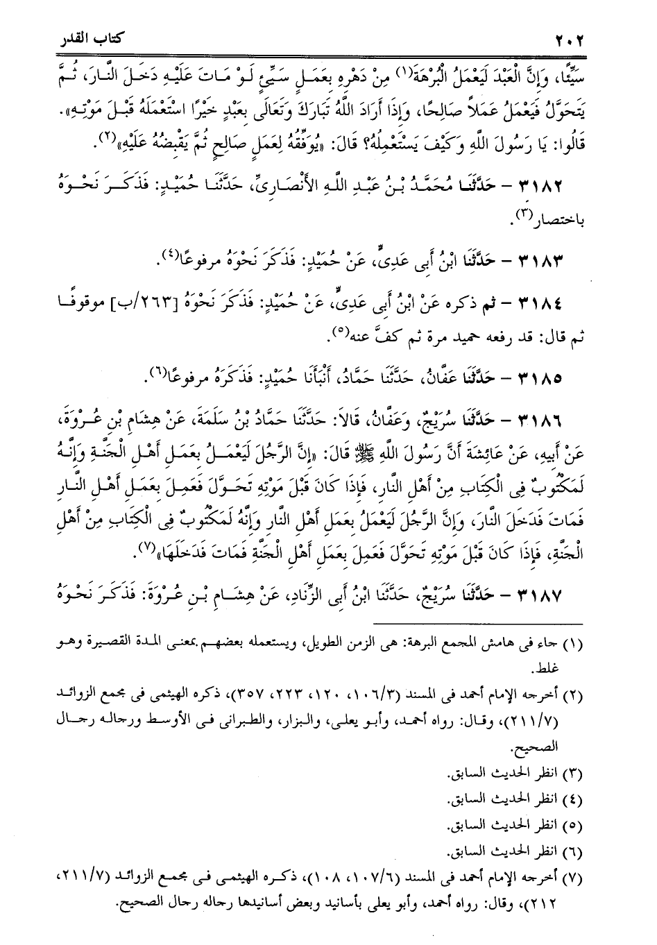 3186 - حَدَّثَنَا سُرَيْجٌ، وَعَفَّانُ، قَالاَ: حَدَّثَنَا حَمَّادُ بْنُ سَلَمَةَ، عَنْ هِشَامِ بْنِ عُرْوَةَ، عَنْ أَبِيهِ، عَنْ عَائِشَةَ أَنَّ رَسُولَ اللَّهِ صلى الله عليه وسلم قَالَ: إِنَّ الرَّجُلَ لَيَعْمَلُ بِعَمَلِ أَهْلِ الْجَنَّةِ وَإِنَّهُ لَمَكْتُوبٌ فِى الْكِتَابِ مِنْ أَهْلِ النَّارِ، فَإِذَا كَانَ قَبْلَ مَوْتِهِ تَحَوَّلَ فَعَمِلَ بِعَمَلِ أَهْلِ النَّارِ فَمَاتَ فَدَخَلَ النَّارَ، وَإِنَّ الرَّجُلَ لَيَعْمَلُ بِعَمَلِ أَهْلِ النَّارِ وَإِنَّهُ لَمَكْتُوبٌ فِى الْكِتَابِ مِنْ أَهْلِ الْجَنَّةِ، فَإِذَا كَانَ قَبْلَ مَوْتِهِ تَحَوَّلَ فَعَمِلَ بِعَمَلِ أَهْلِ الْجَنَّةِ فَمَاتَ فَدَخَلَهَا.