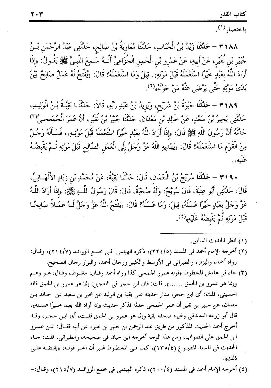 3189 - حَدَّثَنَا حَيْوَةُ بْنُ شُرَيْحٍ، وَيَزِيدُ بْنُ عَبْدِ رَبِّهِ، قَالاَ: حَدَّثَنَا بَقِيَّةُ بْنُ الْوَلِيدِ، حَدَّثَنِى بَحِيرُ بْنُ سَعْدٍ، عَنْ خَالِدِ بْنِ مَعْدَانَ، حَدَّثَنَا جُبَيْرُ بْنُ نُفَيْرٍ، أَنَّ عُمَرَ الْجُمَعحىَّ حَدَّثَهُ أَنَّ رَسُولَ اللَّهِ صلى الله عليه وسلم قَالَ: إِذَا أَرَادَ اللَّهُ بِعَبْدٍ خَيْرًا اسْتَعْمَلَهُ قَبْلَ مَوْتِهِ، فَسَأَلَهُ رَجُلٌ مِنَ الْقَوْمِ مَا اسْتَعْمَلَهُ؟ قَالَ: يَهْدِيهِ اللَّهُ عَزَّ وَجَلَّ إِلَى الْعَمَلِ الصَّالِحِ قَبْلَ مَوْتِهِ ثُمَّ يَقْبِضُهُ عَلَيه.